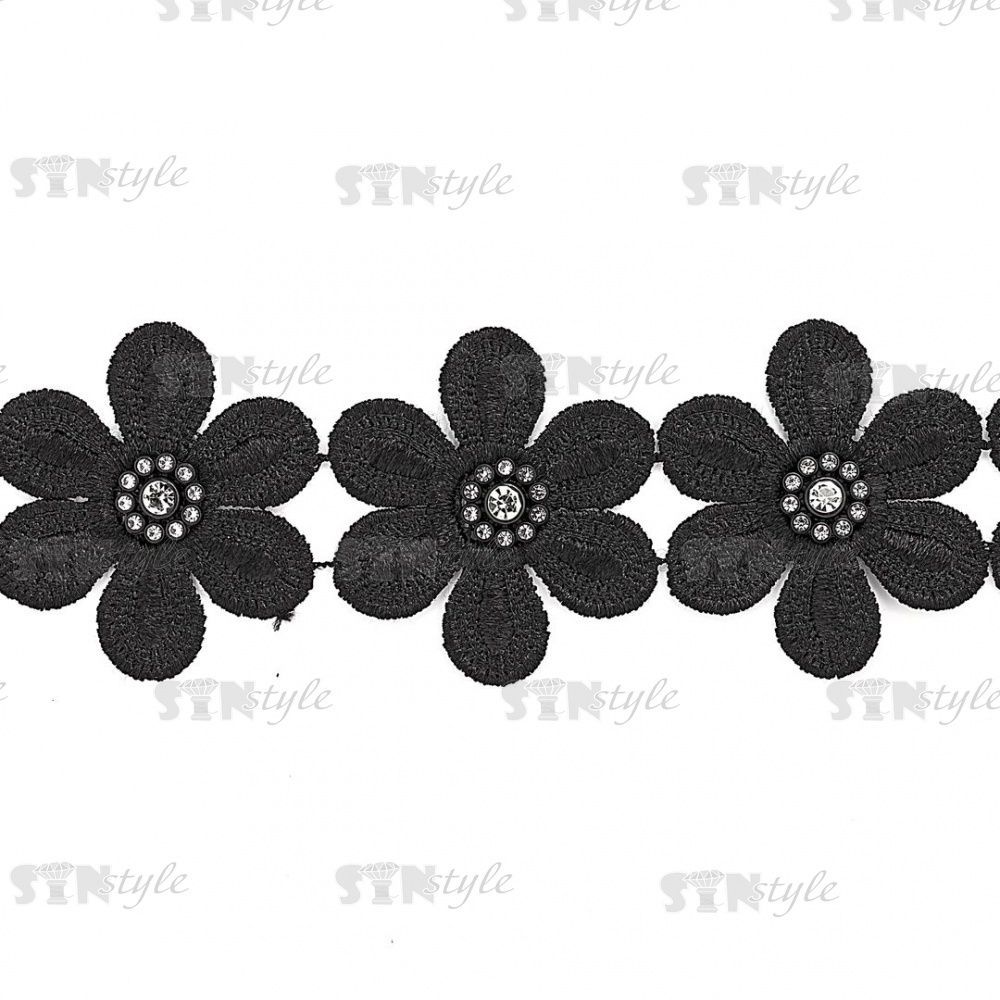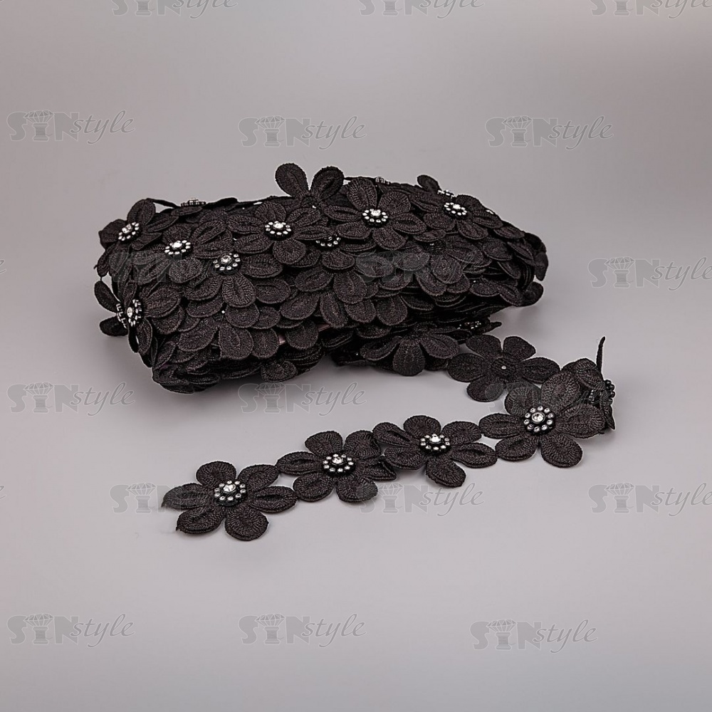 Кружево "Цветочное", красивая цветочная гирлянда со тразами в середине каждого цветка, ширина 50 мм, цвет черный, намотка 15 ярдов