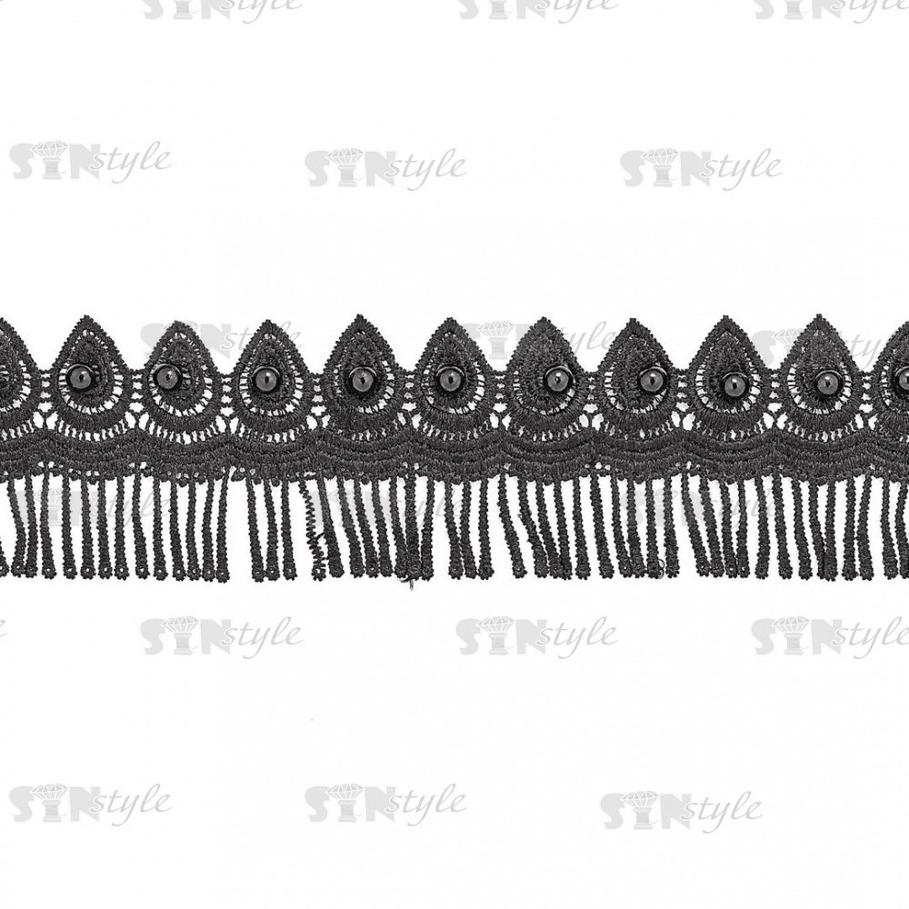 Кружево ажурное с отделкой бусинами, ширина 80 мм, цвет черный, намотка 15 ярдов