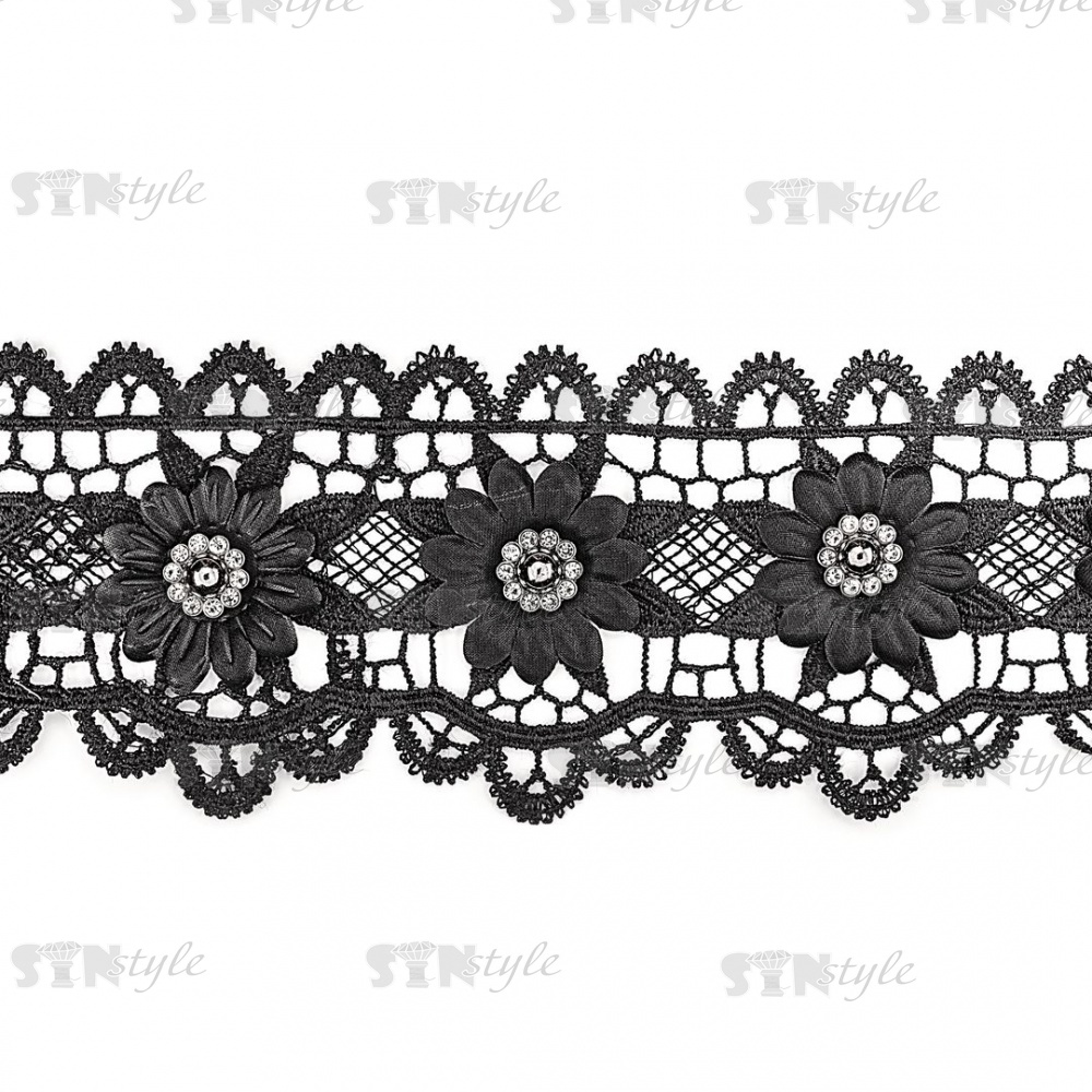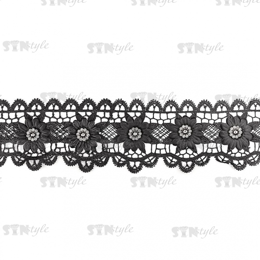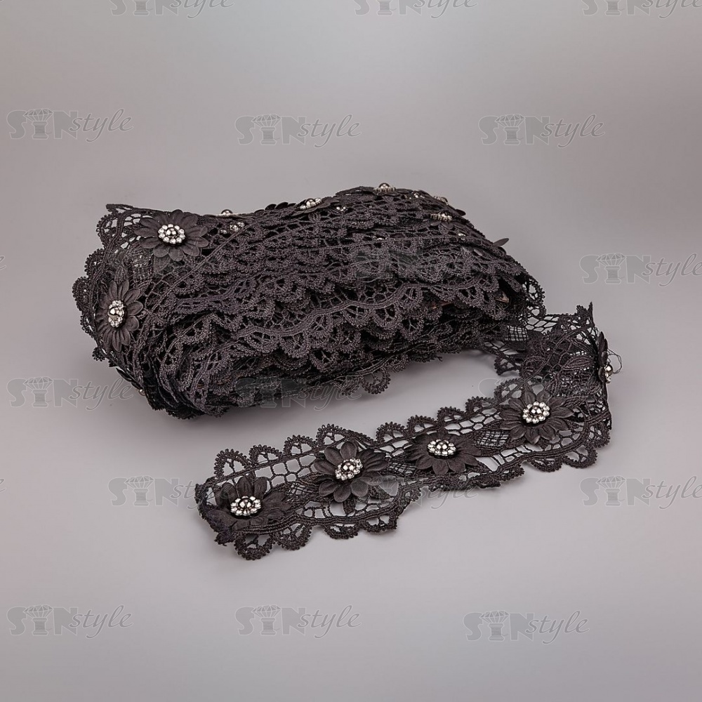 Кружево ажурное с отделкой, на нежной кружевной основе цветочная гирлянда с крупной стразой в центре каждого цветка, ширина 75 мм, намотка 15 ярдов, цвет черный