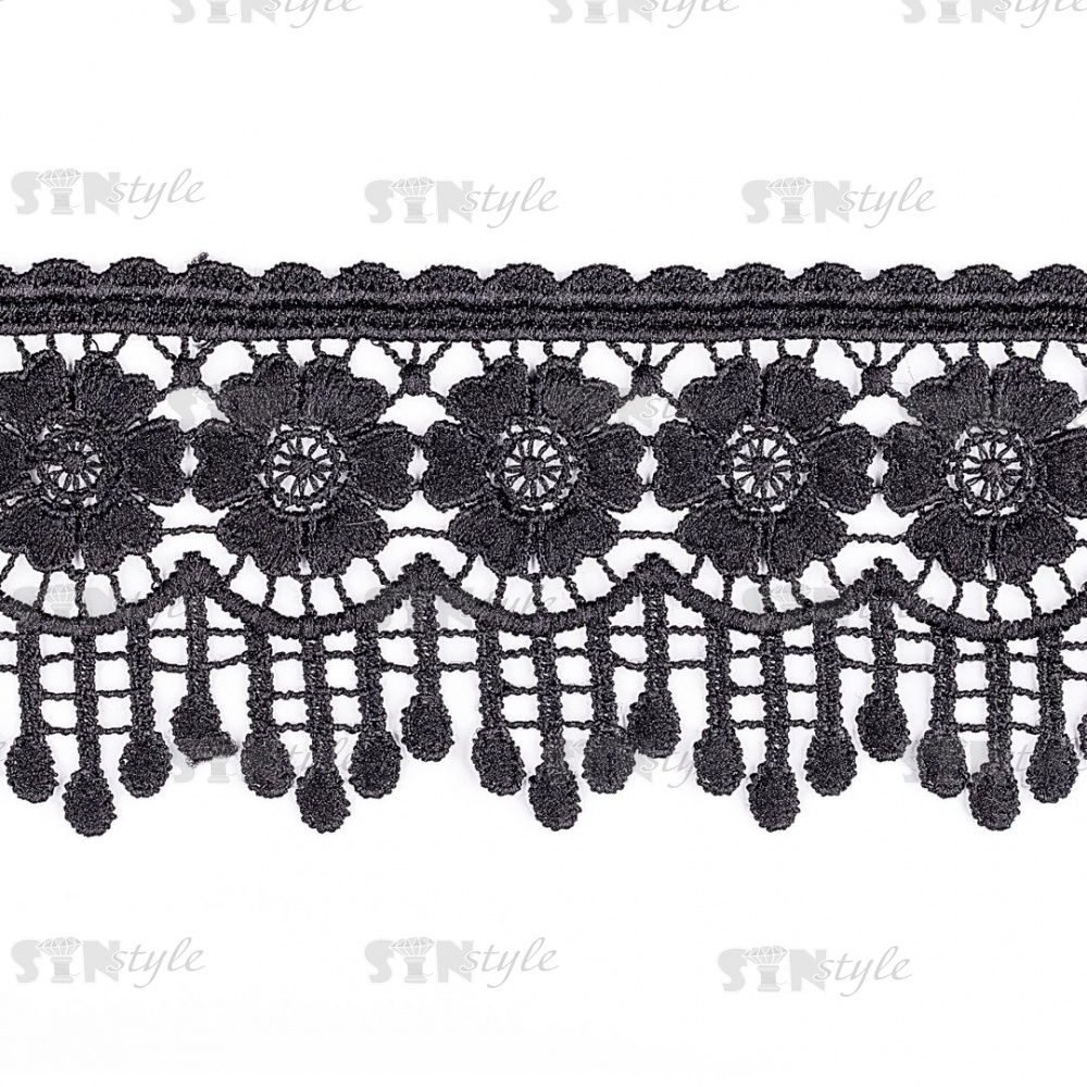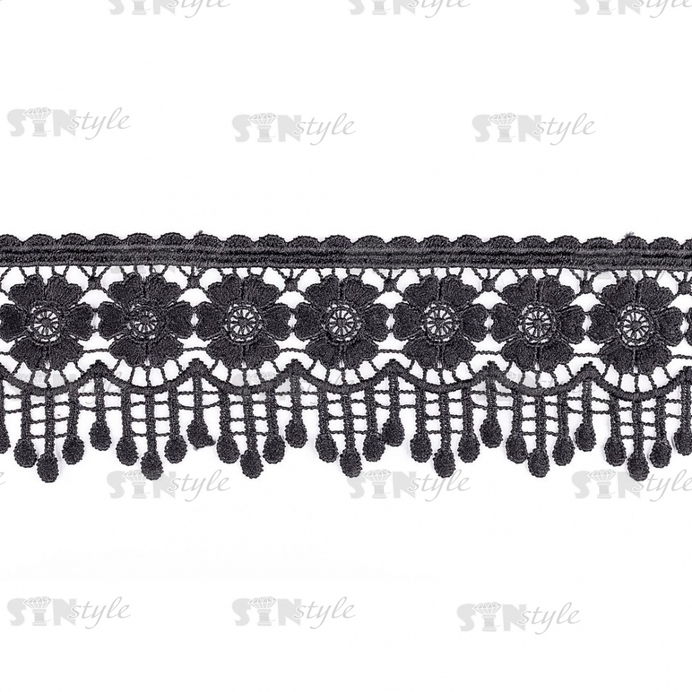 Кружево ажурное, нежная цветочная гирлянда с причудливым узором и резными краями, ширина 65 мм, цвет черный, намотка 15 ярдов