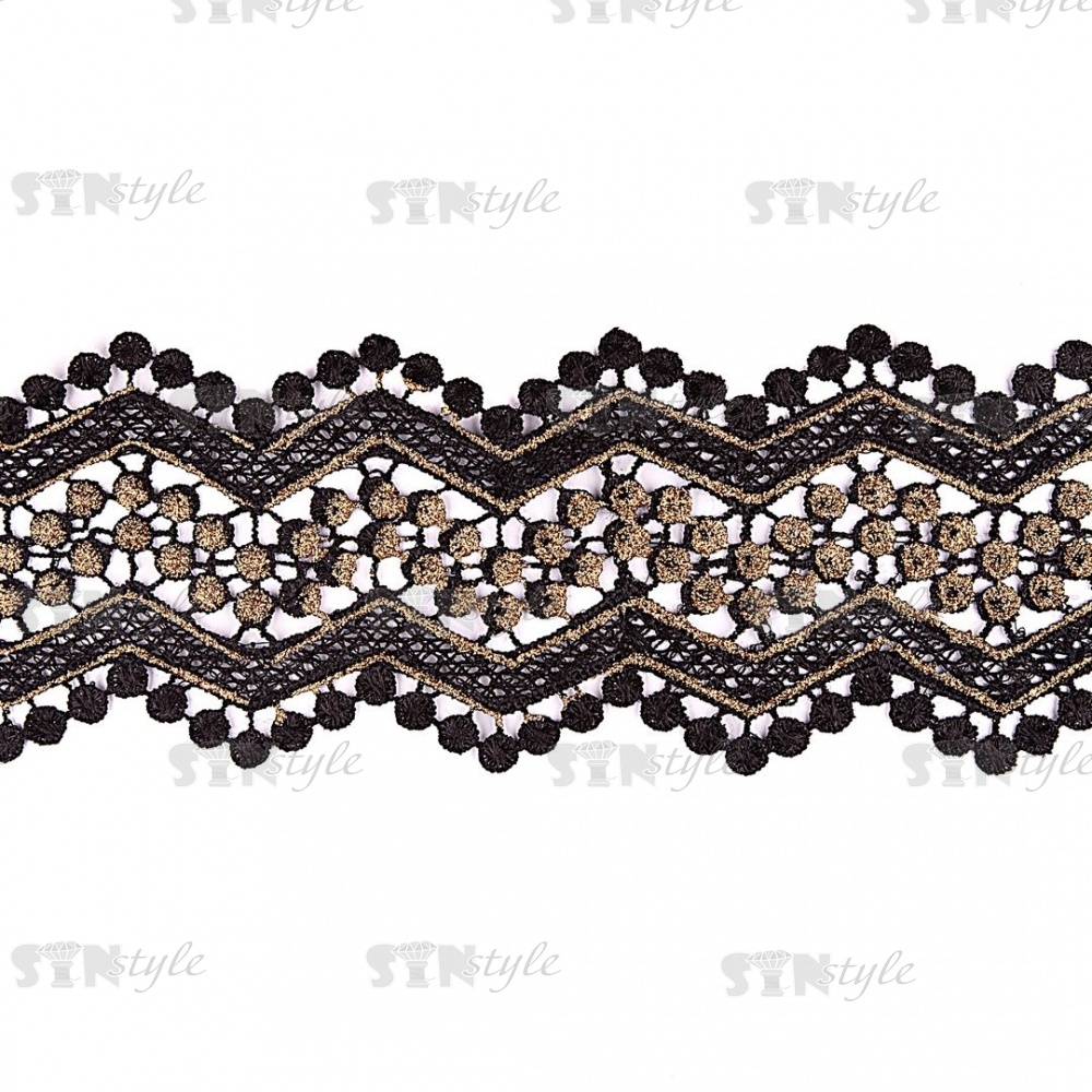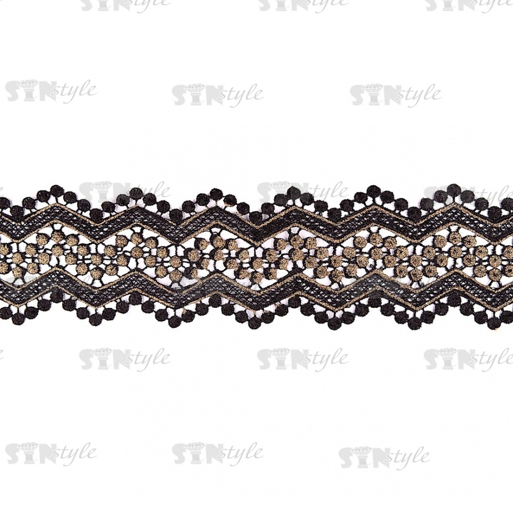 Кружево ажурное двустороннее, интересное двухцветное переплетение с зигзагообразным краем, ширина 90 мм, цвет черный+золото, намотка 15 ярдов