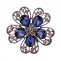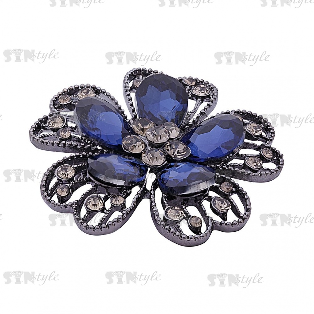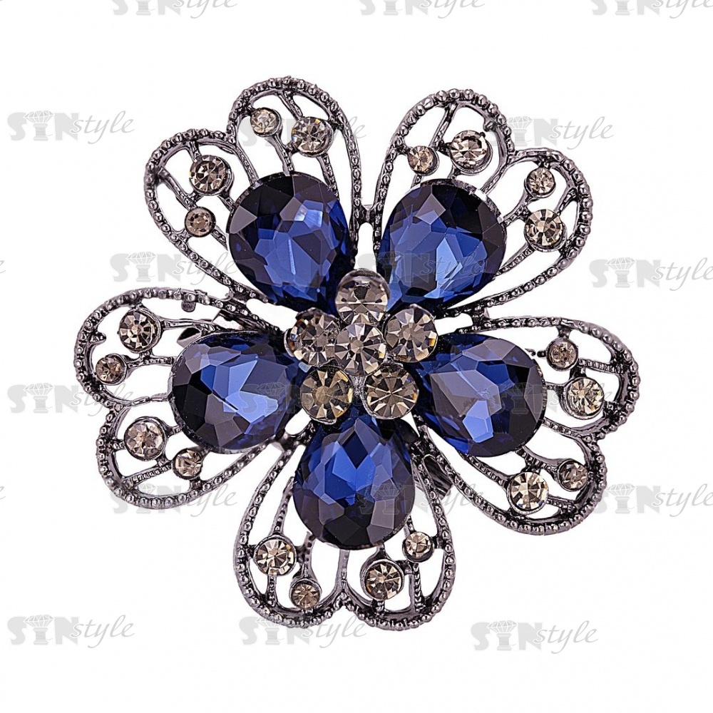 Брошь со стразами, размер 47 мм, цвет темный никель+синие стразы, застежка булавка