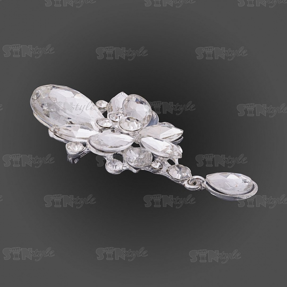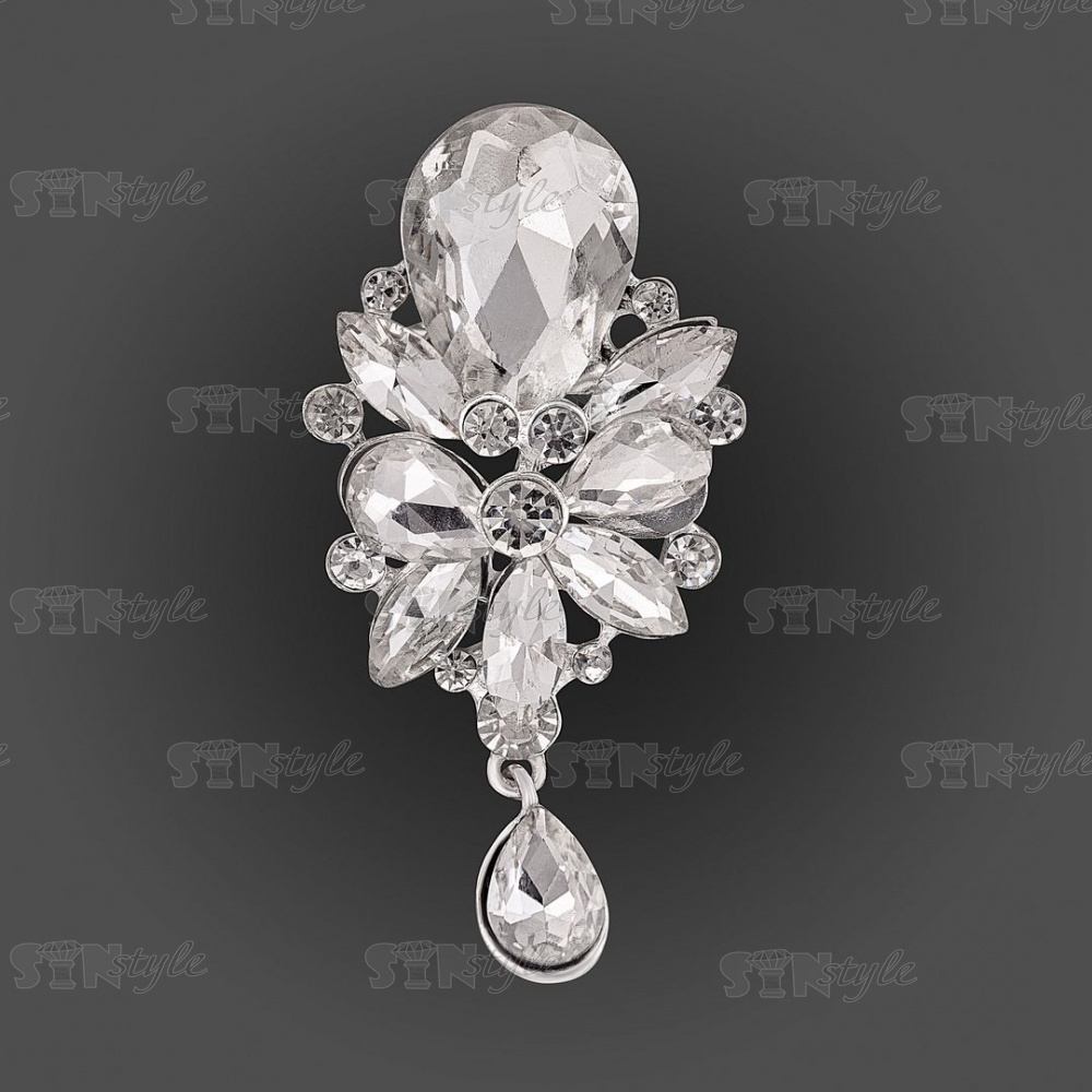 Брошь с подвеской, застежка булавка, цвет серебряный+белые стразы, размер 36х80 мм