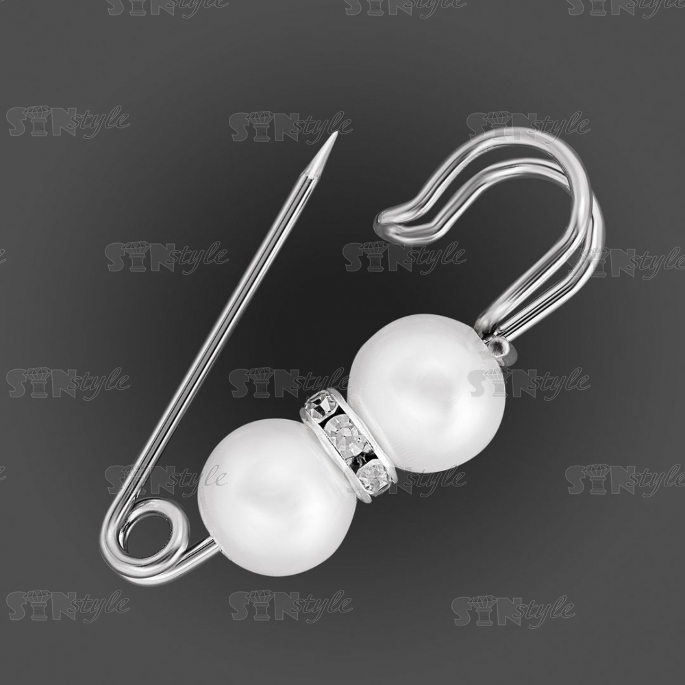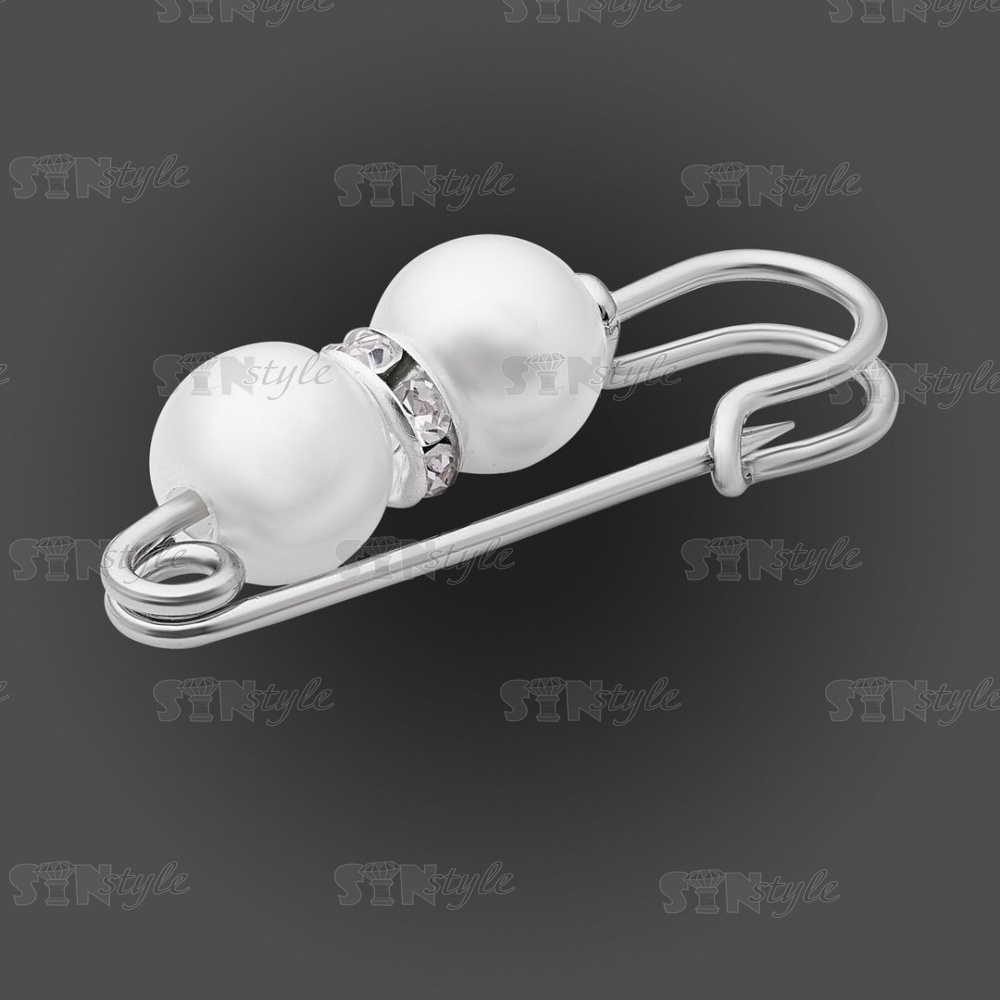 Булавка металлическая со стразами и бусинами, цвет серебро, размер 32х14 мм
