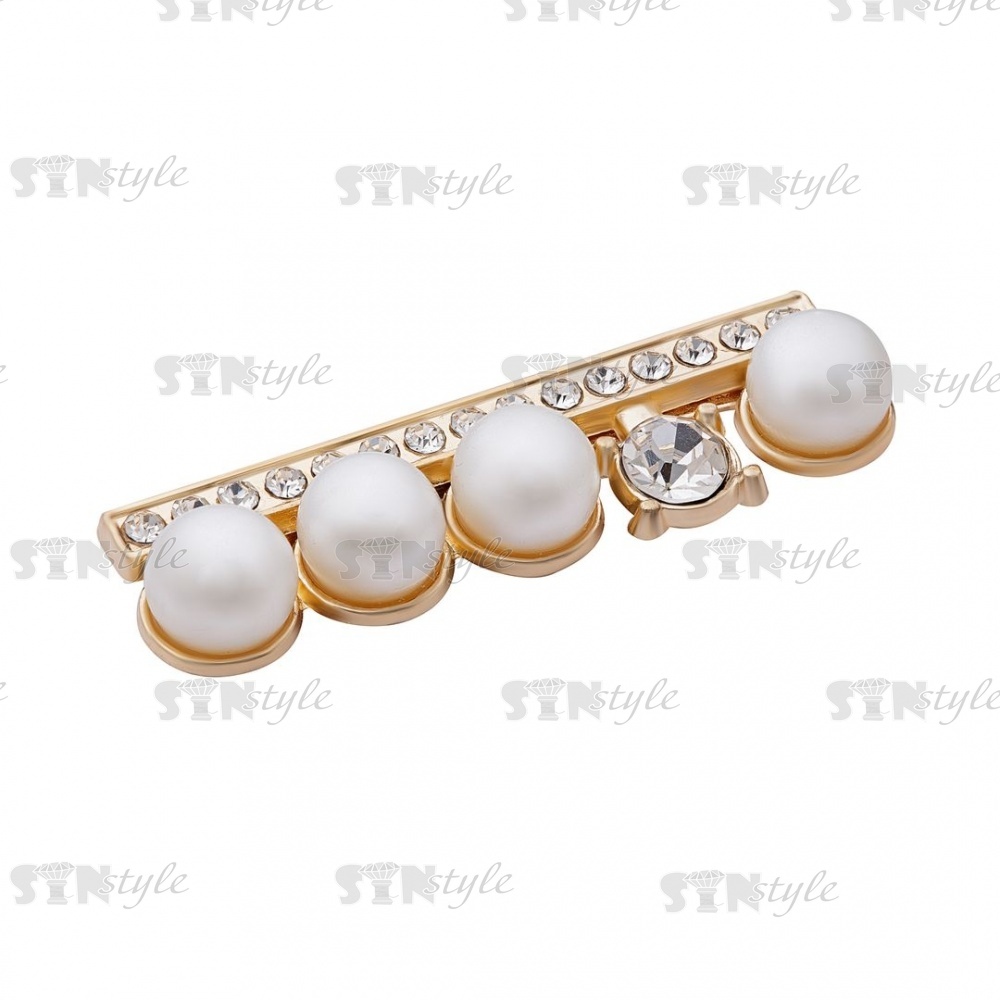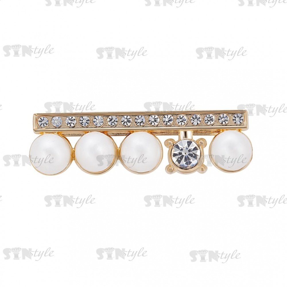 Брошь металлическая, крепление усики, цвет золотой + белая страза и бусины, размер 38х11 мм