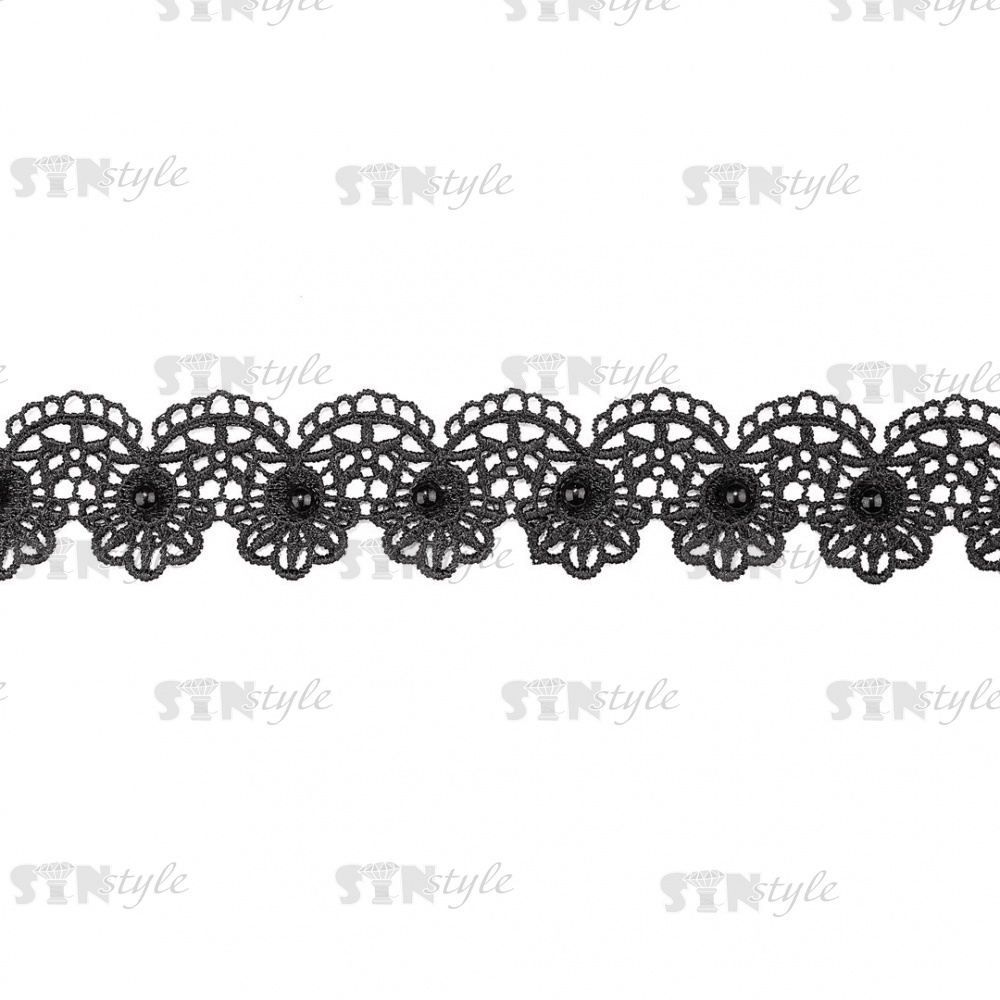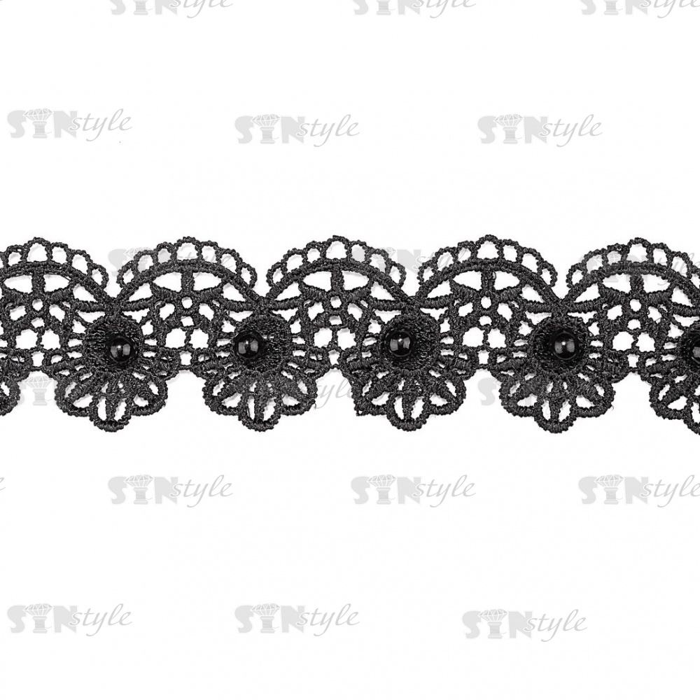Кружево ажурное с отделкой, нежнейшее тонкое переплетение гирлянды с цветочными мотивами с бусиной в центре цветка, ширина 35 мм, намотка 15 ярдов, цвет черный