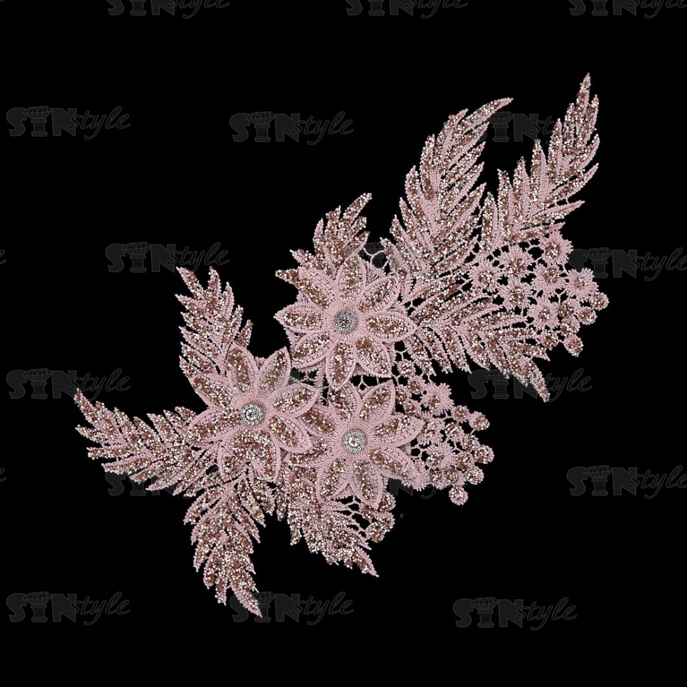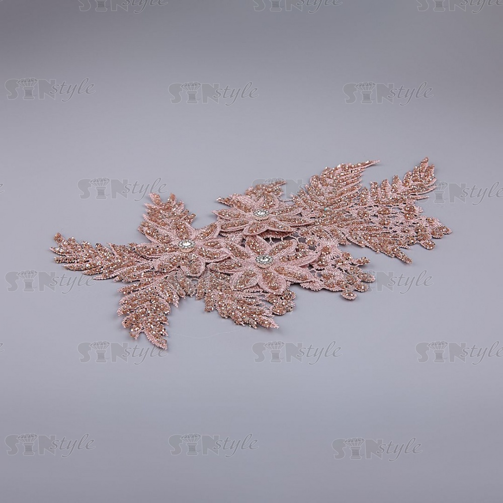 Аппликация кружевная пришивная с глиттером и стразами, размер 160х300 мм, цвет грязно-розовый