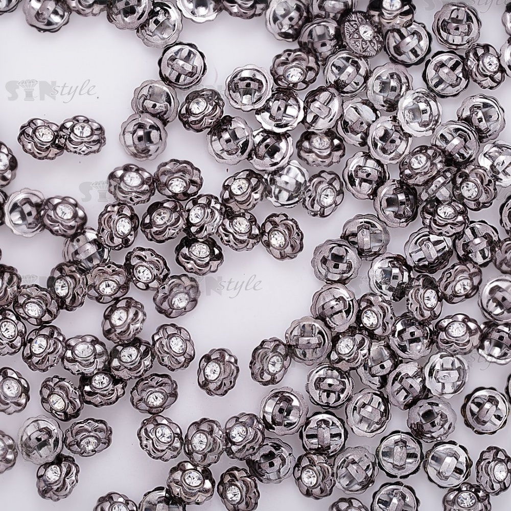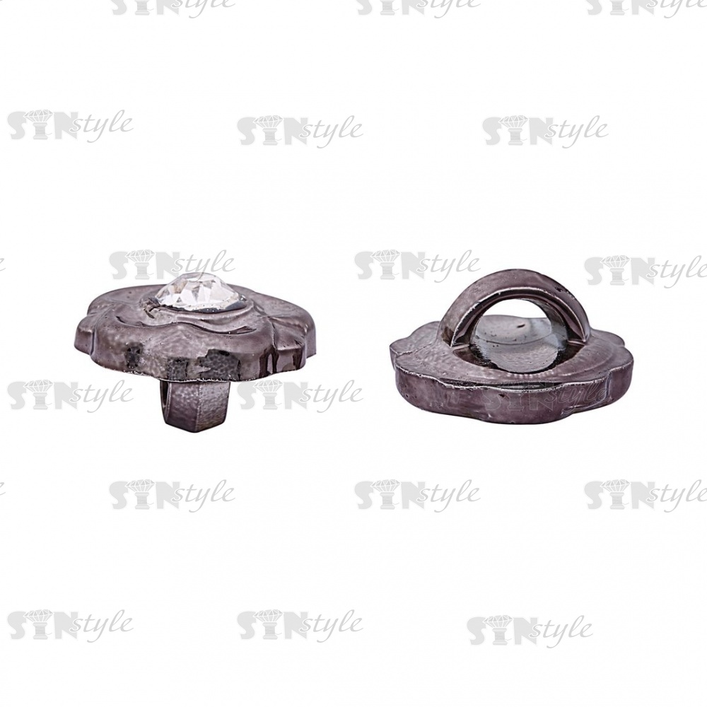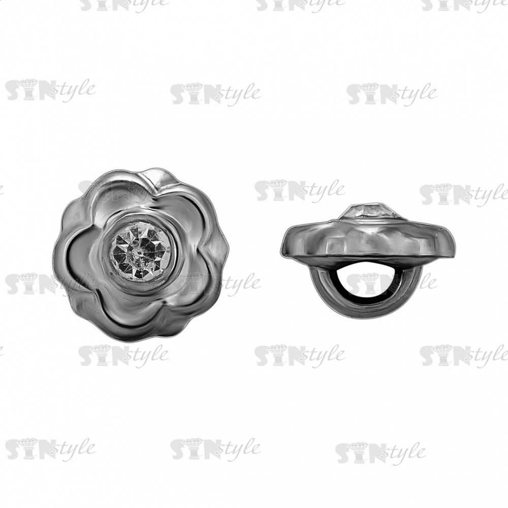 Пуговица пластиковая на ножке, в форме цветка, цвет темный никель, белая страза в центре, размер 18L