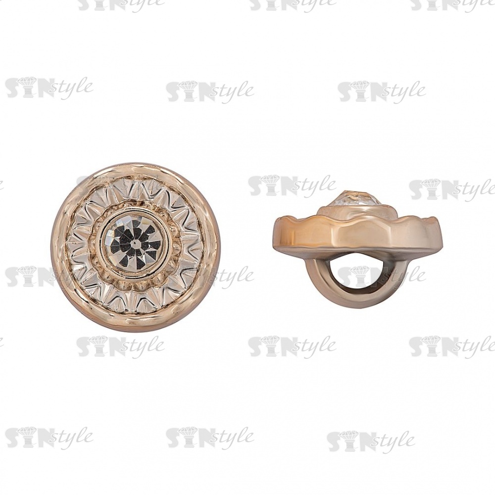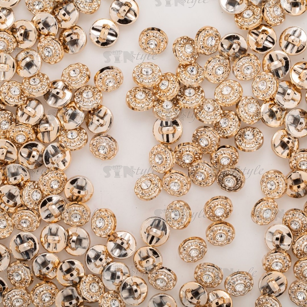 Пуговица пластиковая на ножке, размер 18L, форма круглая с волнистыми краями, цвет золотой, в центре шляпки белая страза