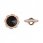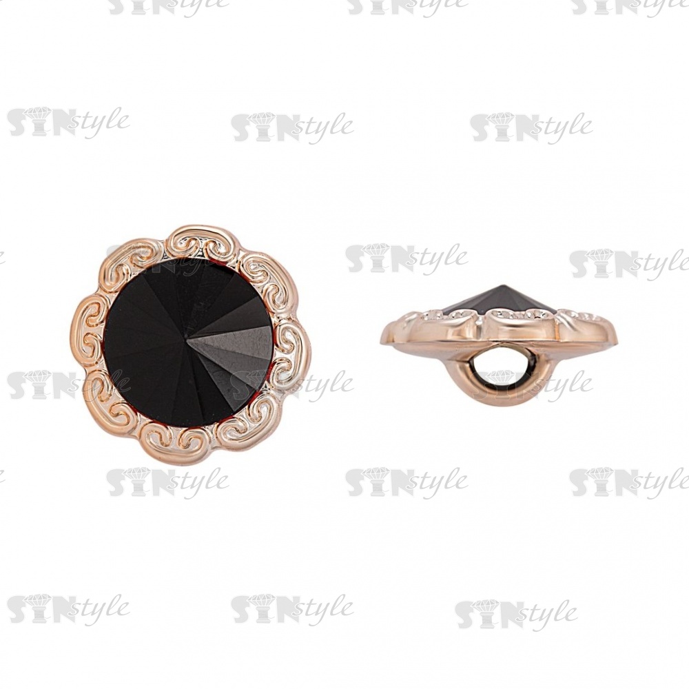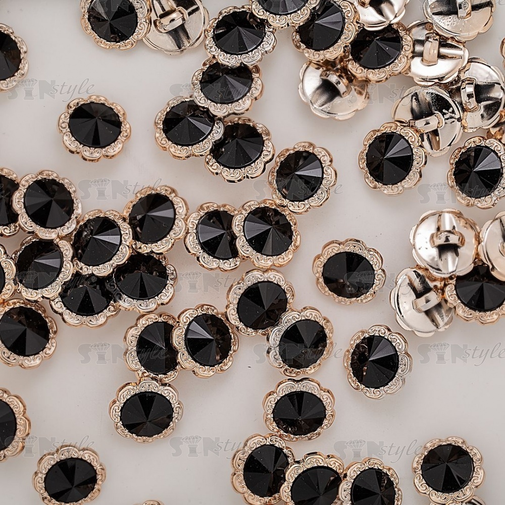 Пуговица пластиковая на ножке, круглая с ажурным бортиком, основа золотая, вставка в виде черной стразы, 28L