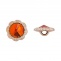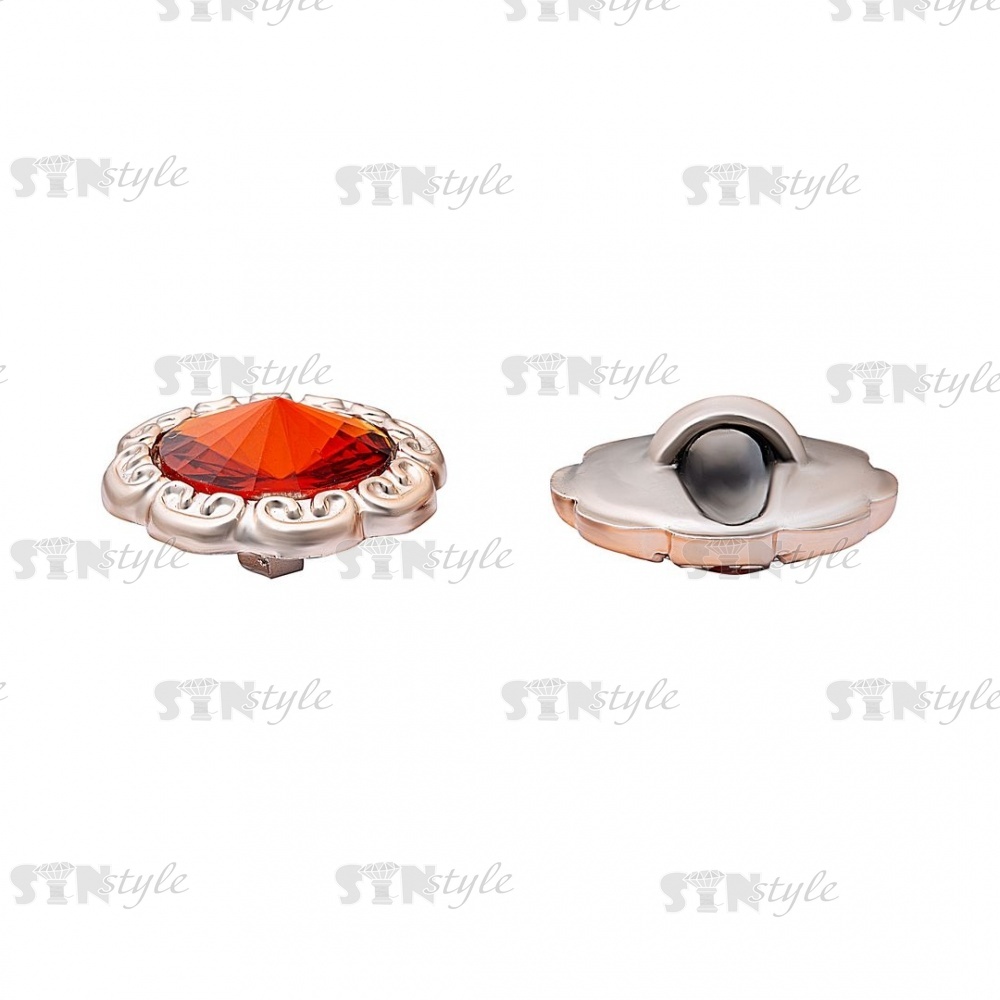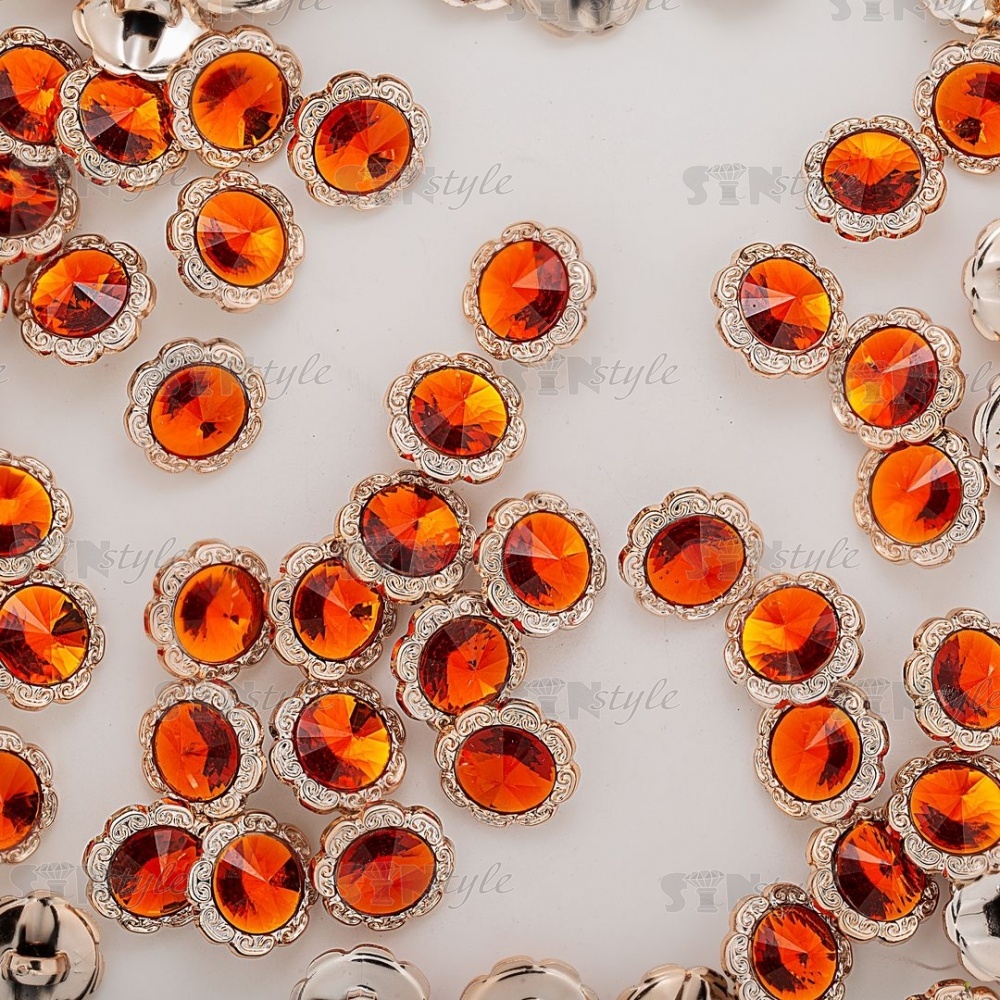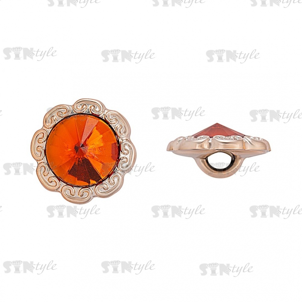 Пуговица пластиковая на ножке, круглая с ажурным бортиком, основа золотая, вставка в виде оранжевой стразы, 28L