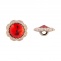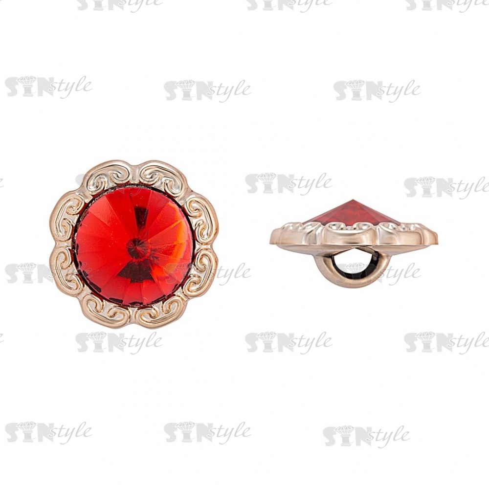 Пуговица пластиковая на ножке, круглая с ажурным бортиком, основа золотая, вставка в виде красной стразы, 28L