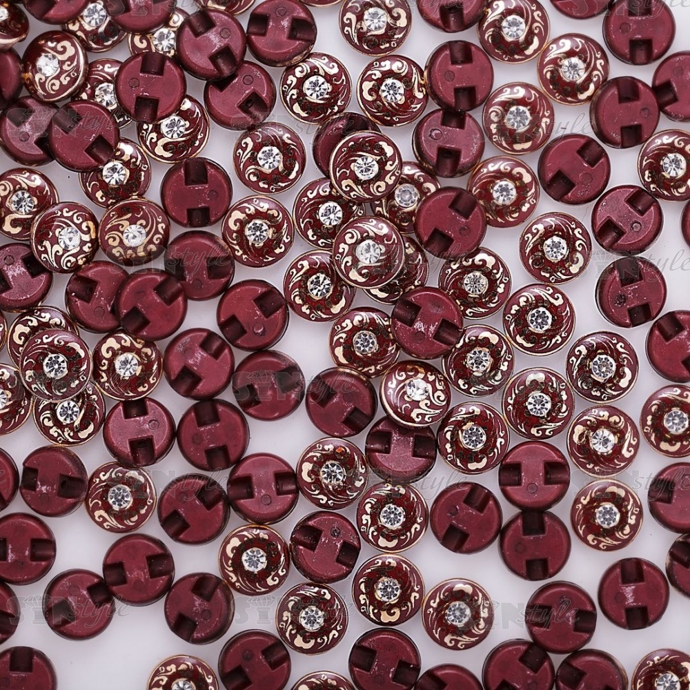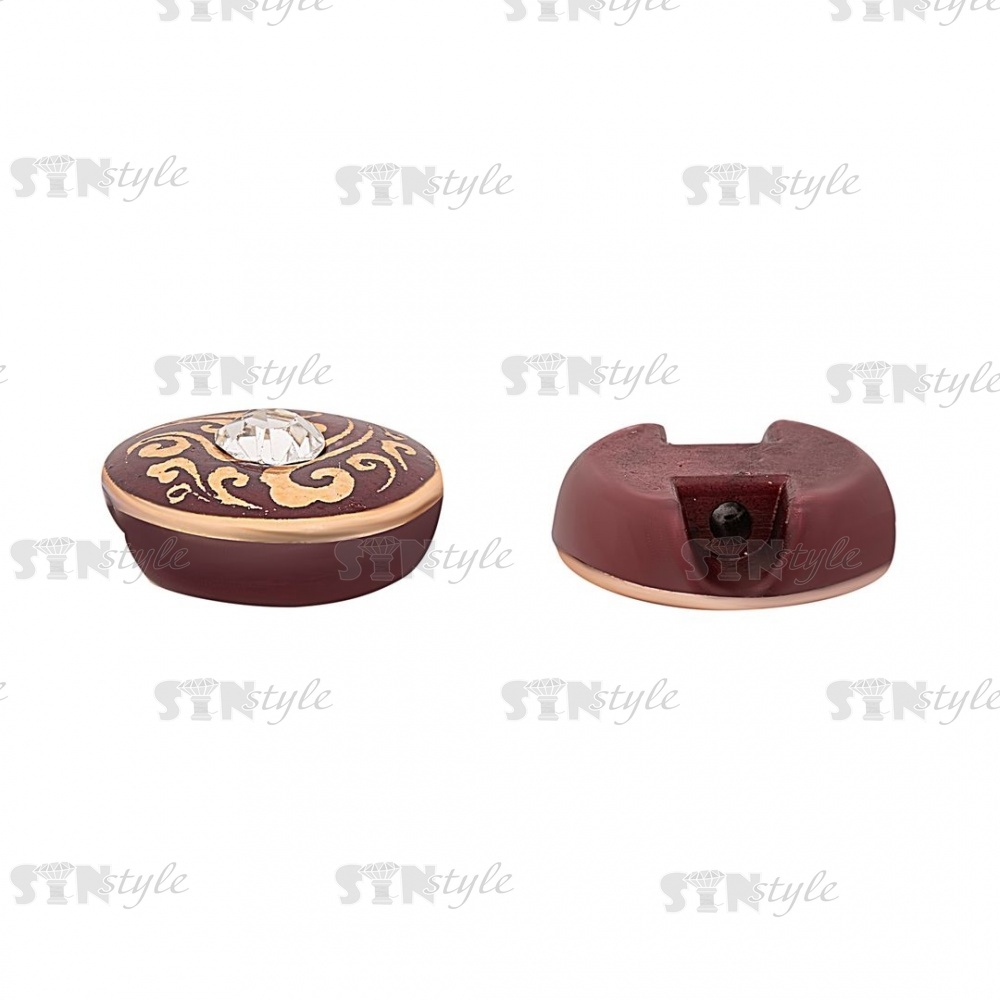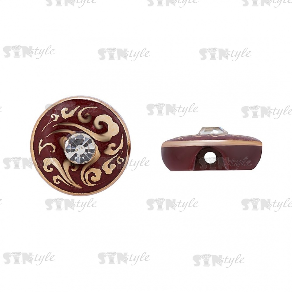 Пуговица пластиковая на полуножке, размер 20L, круглой формы, цвет бордовый, золотой арнамент, белая страза