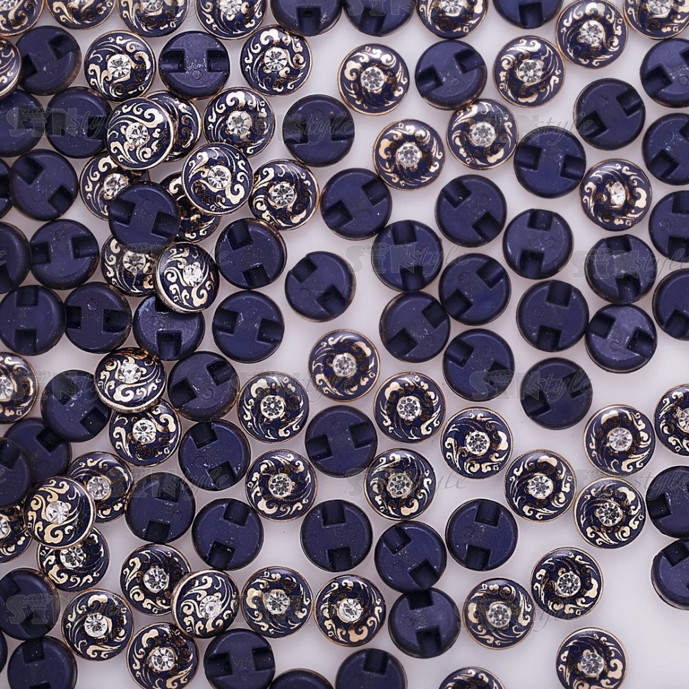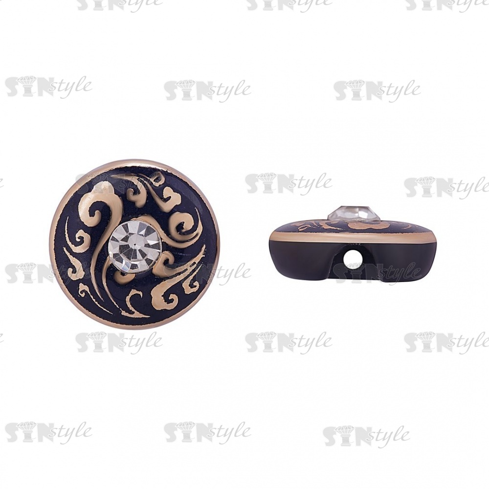Пуговица пластиковая на полуножке, размер 20L, круглой формы, цвет черный, золотой арнамент, белая страза