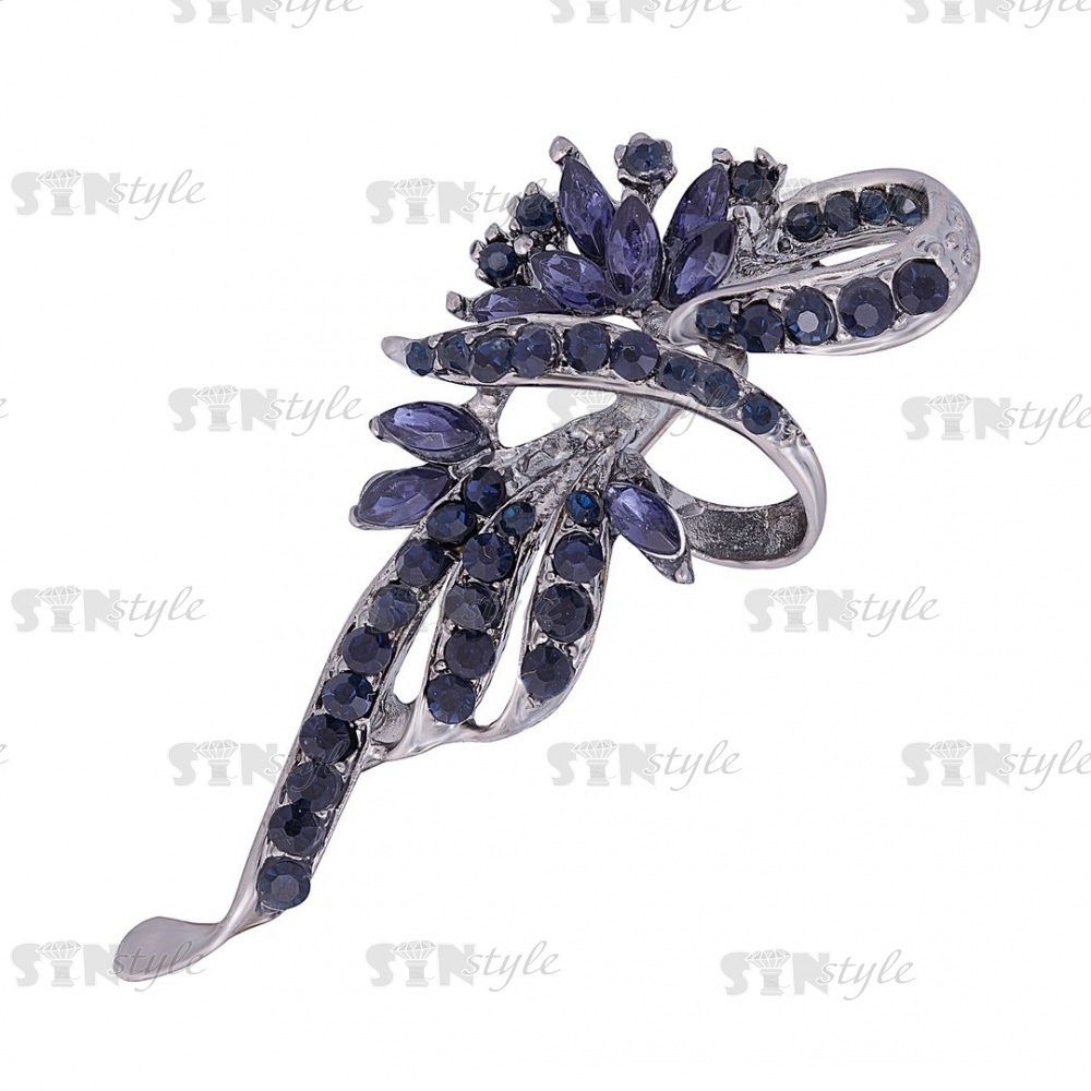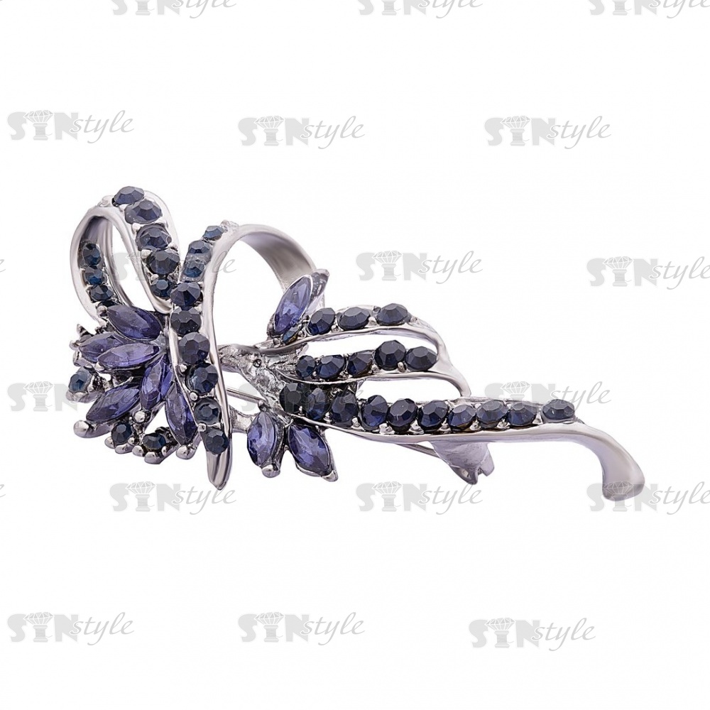 Брошь металлическая со стразами, цвет никель+синие стразы, застежка булавка, размер 25х63 мм