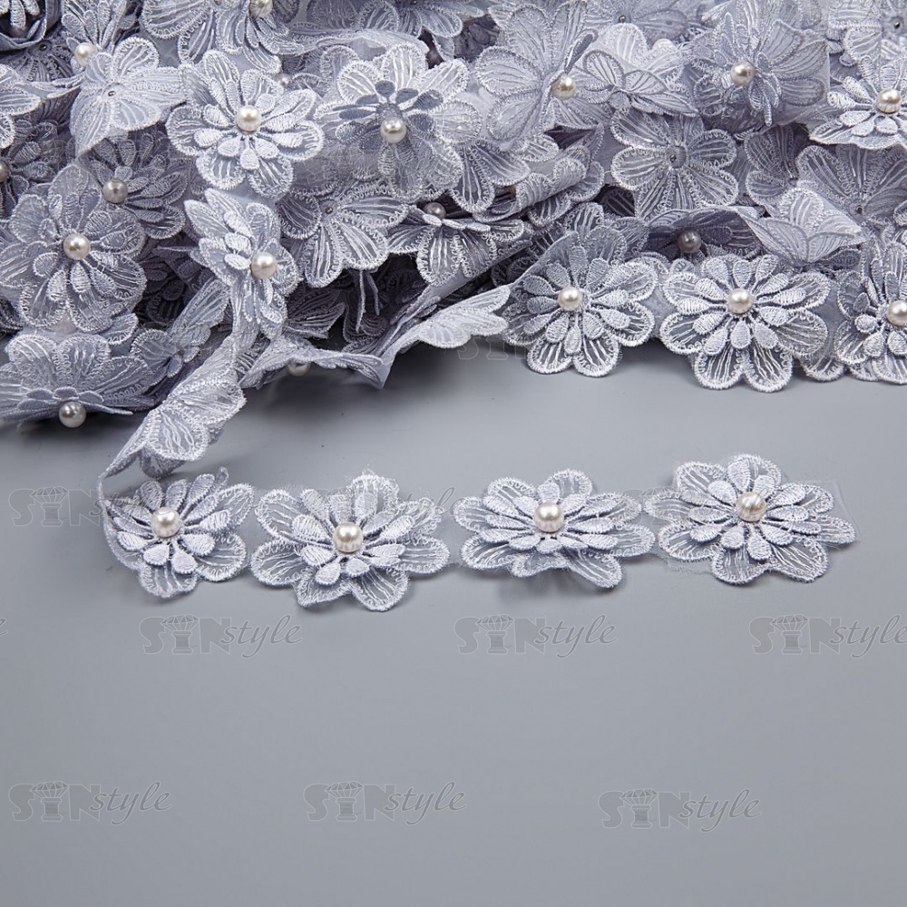 Цветочки из капроновой ленты, ширина 55 мм, намотка 20 ярдов, цвет серый (№ 32)+белые бусины