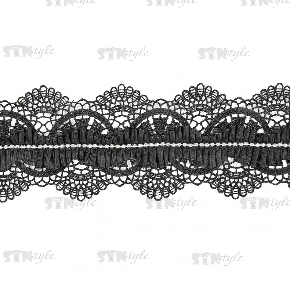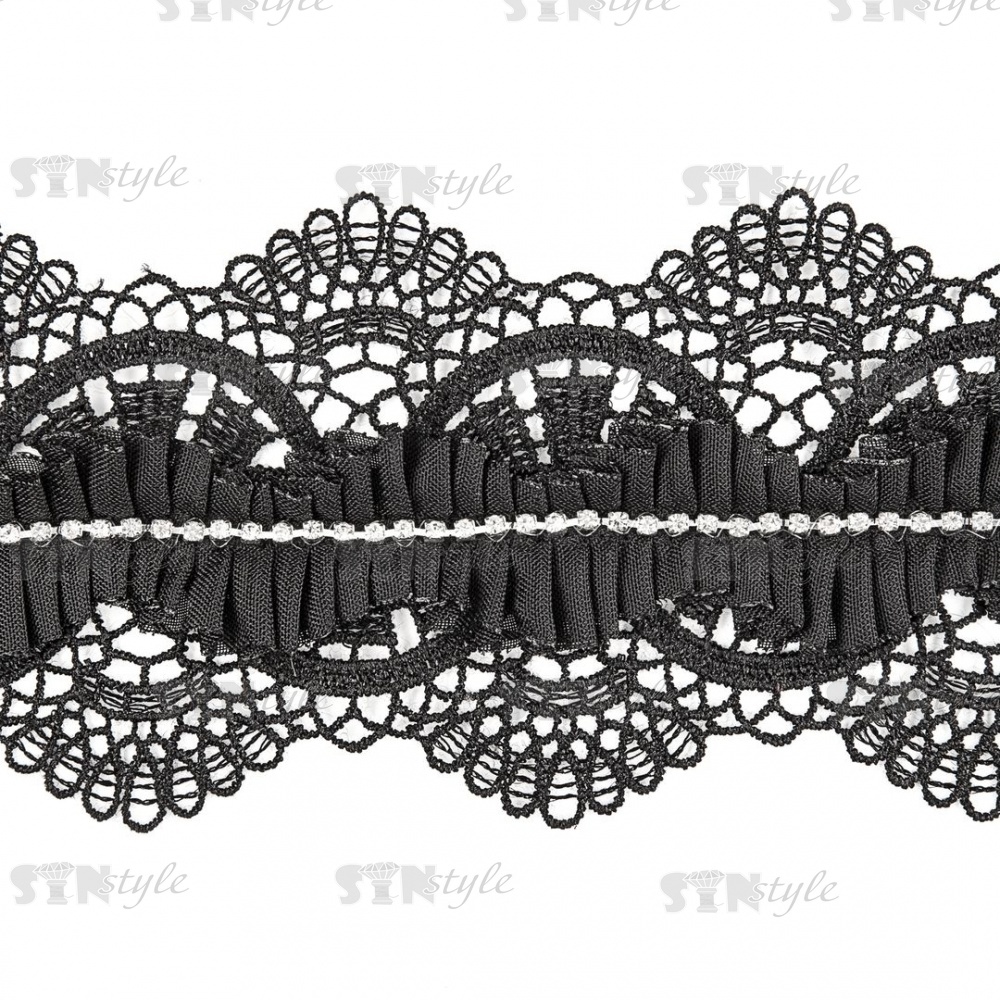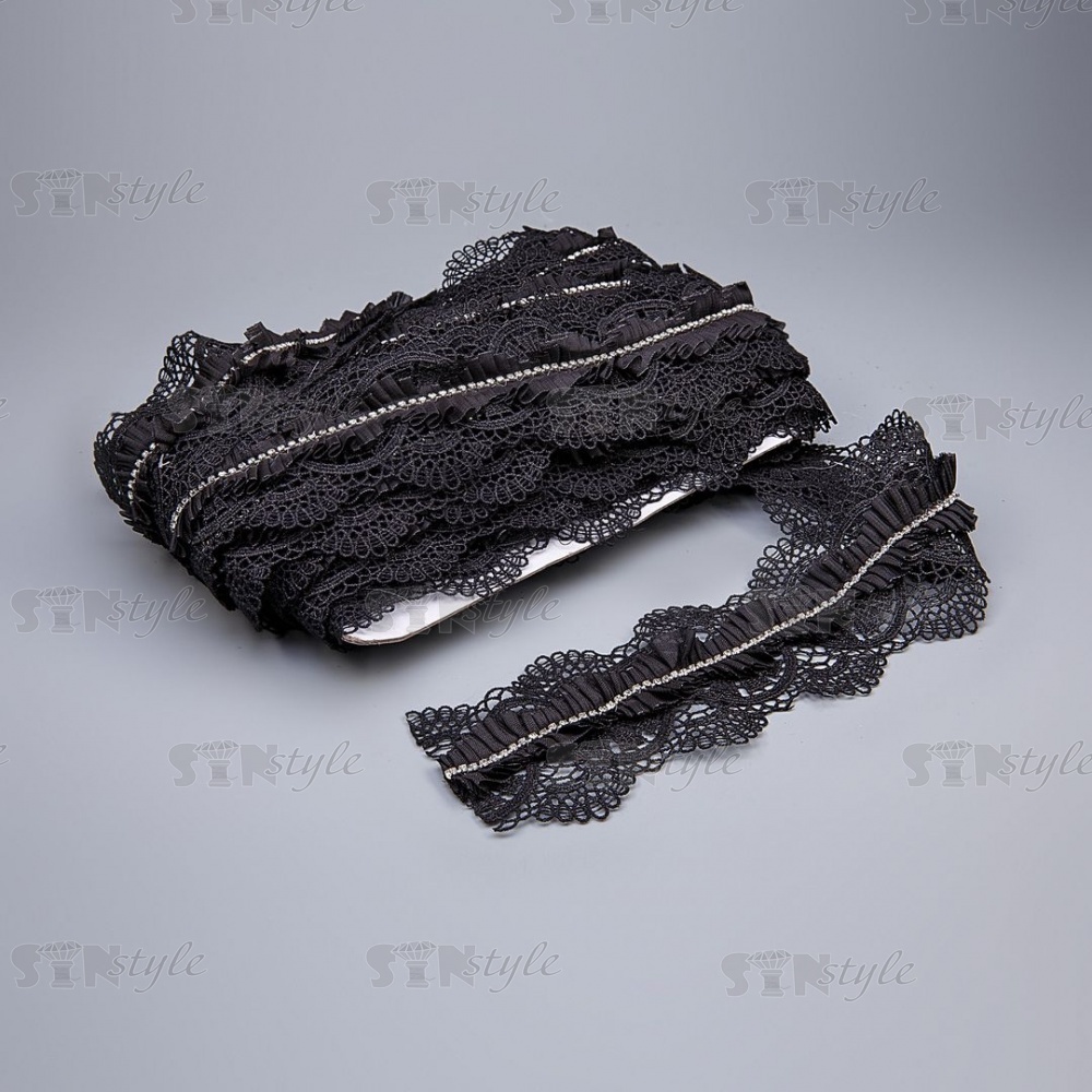 Кружево ажурное с отделкой, на нежной кружевной основе тонкий капроновый рюш с ниткой блестящих белых стразин, ширина 65 мм, намотка 15 ярдов, цвет черный