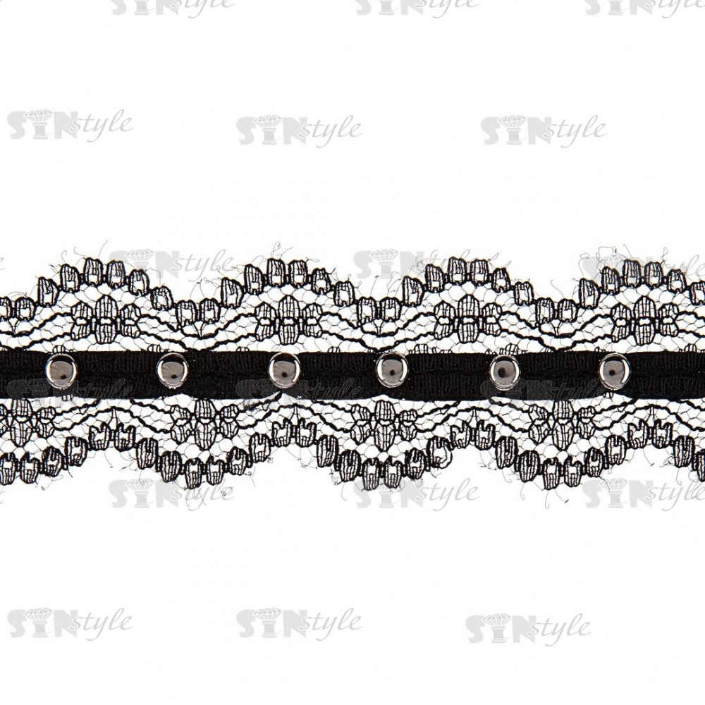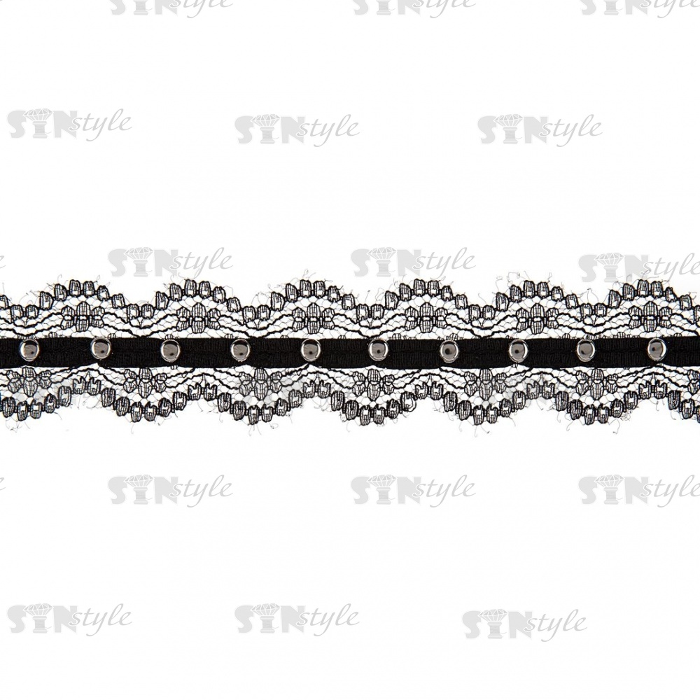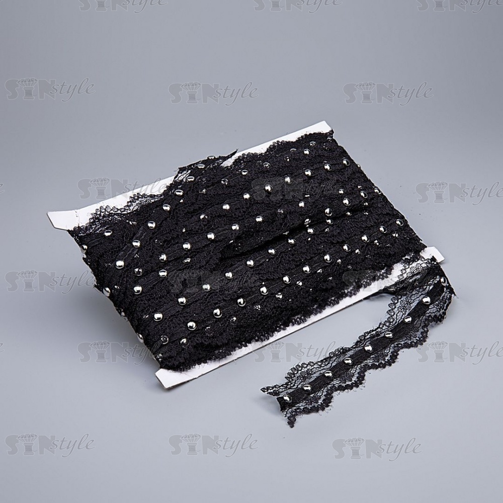 Кружево ажурное, отделанное тесьмой с заклепками, ширина 25 мм, намотка 15 ярдов, цвет черны+темный никель