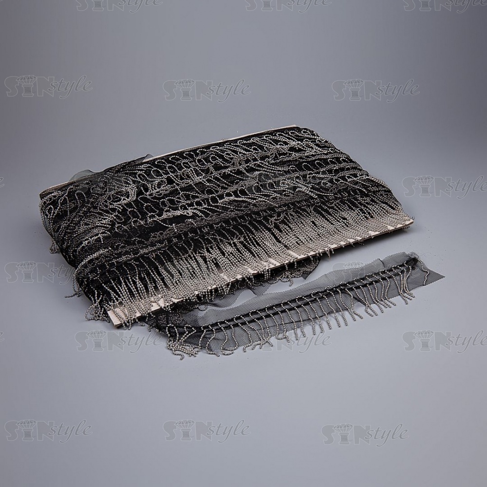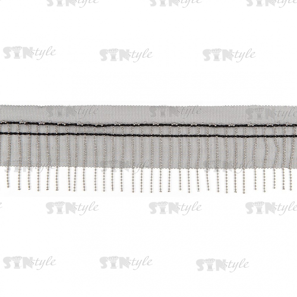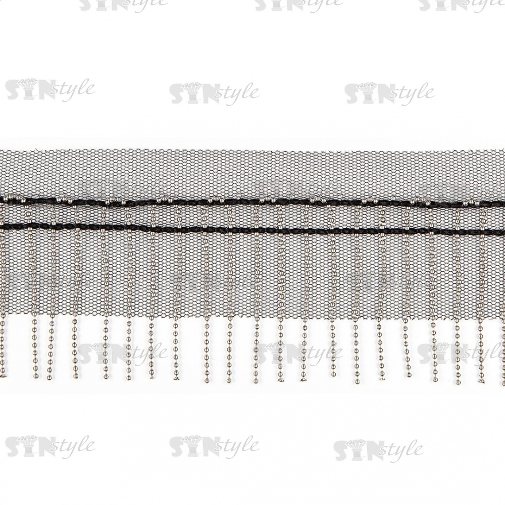 Декоративная тесьма с бахромой отделочная на сетке, ширина 50 мм, цвет черный+цепочка цвет никель, намотка 25 ярдов