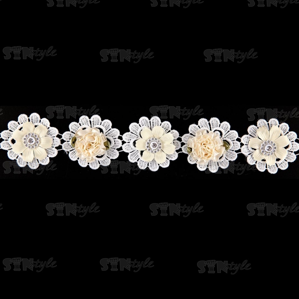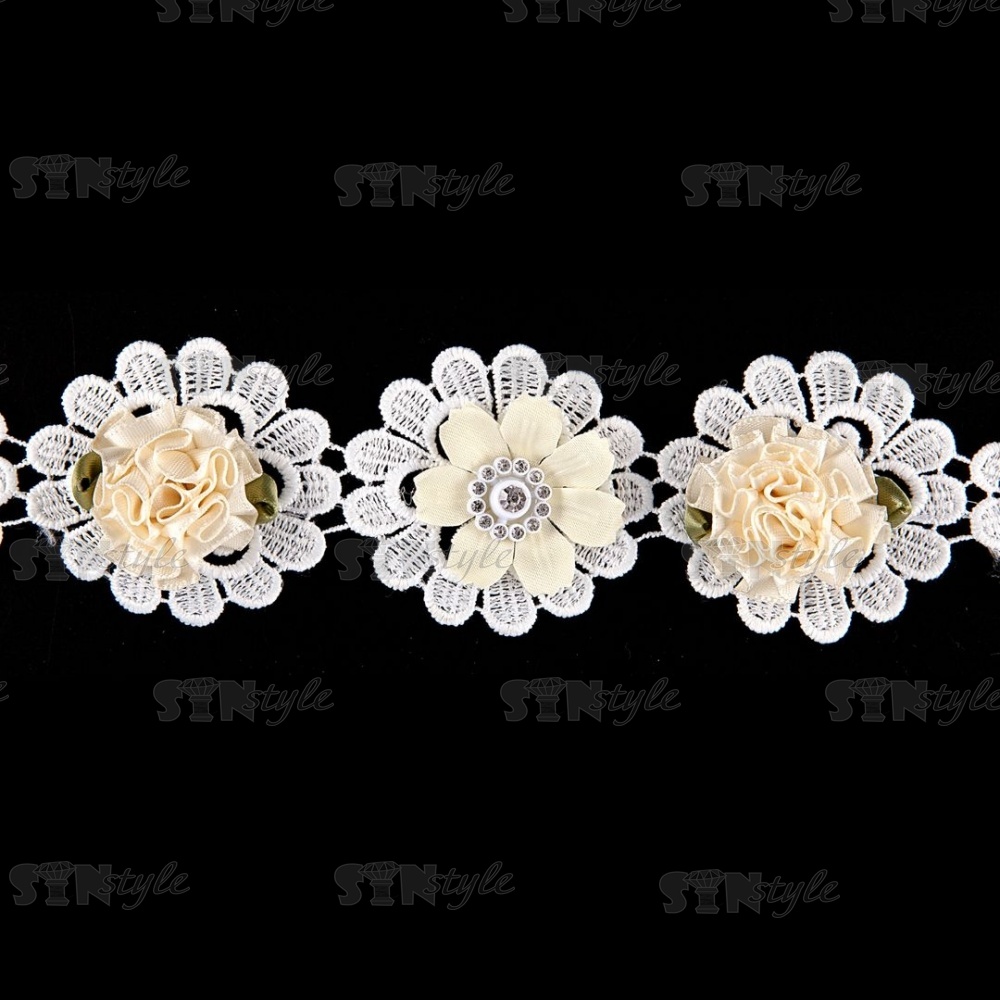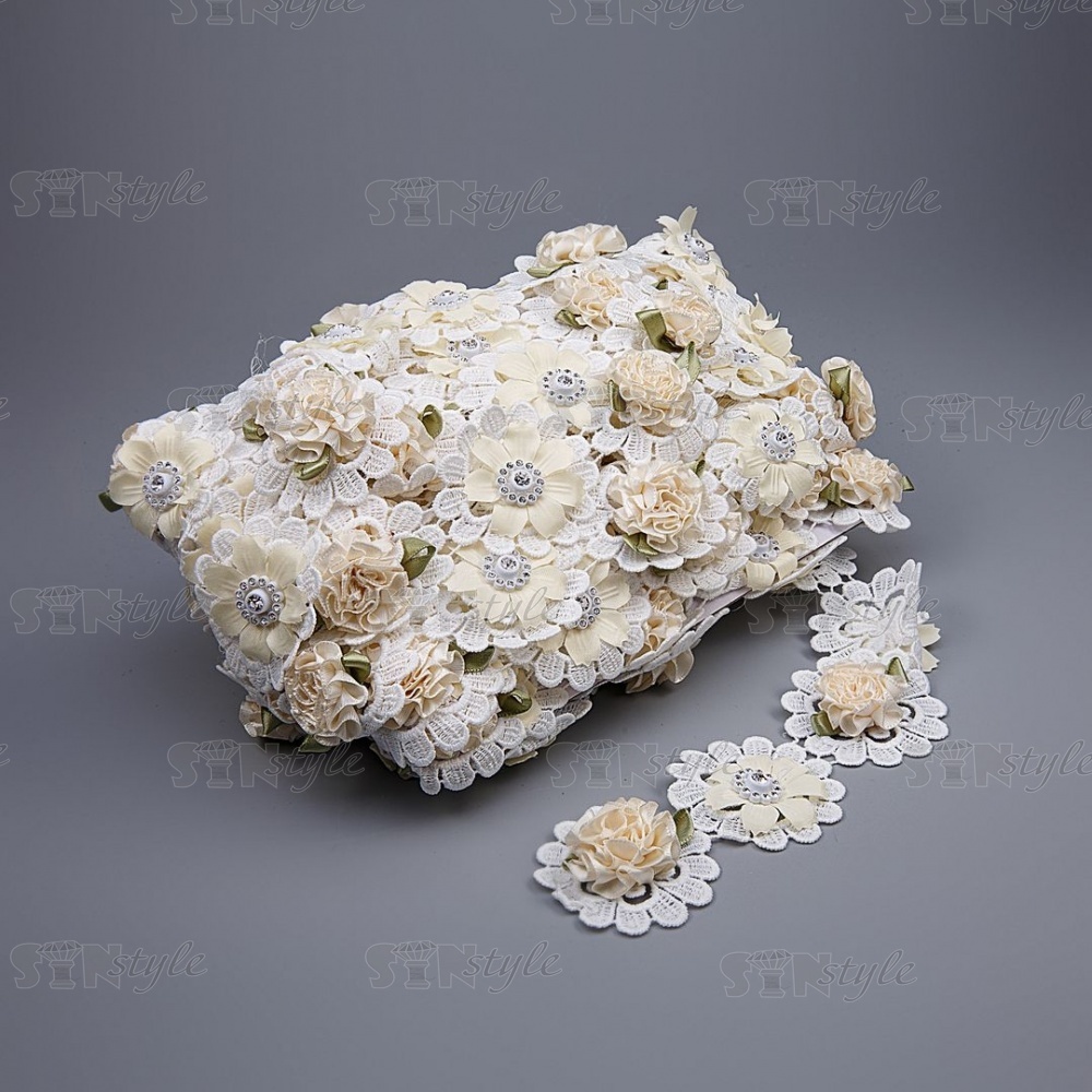 Цветочное кружево, декорированное объемными цветами и стразами, ширина 48 мм, цвет белый, намотка 15 ярдов