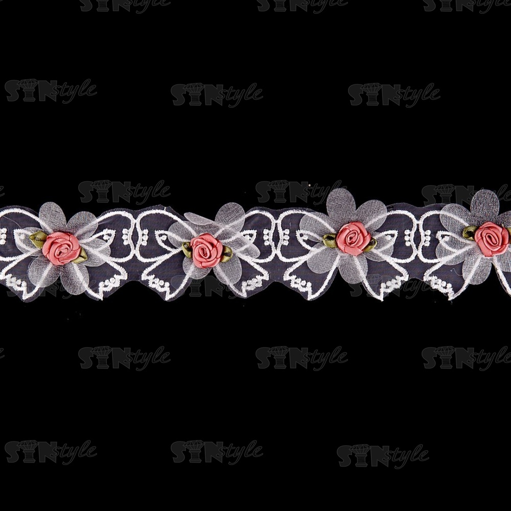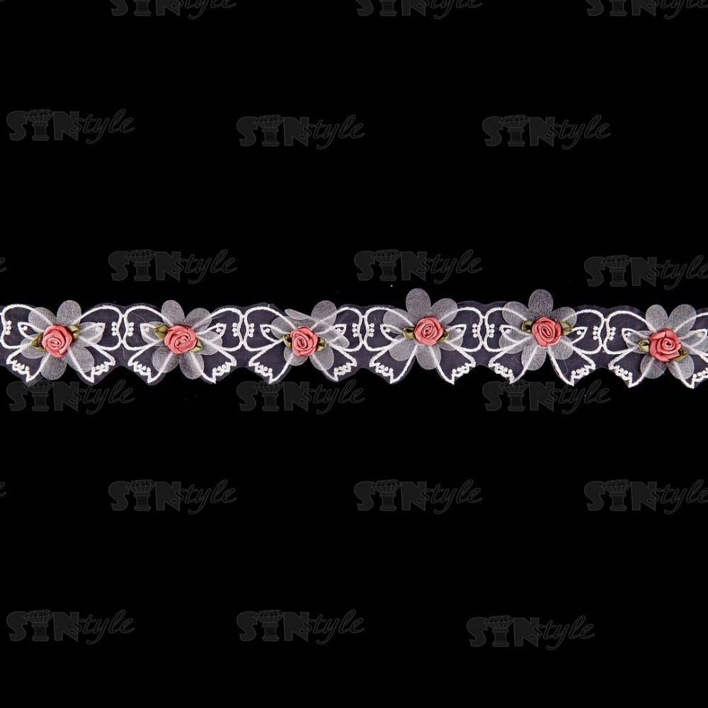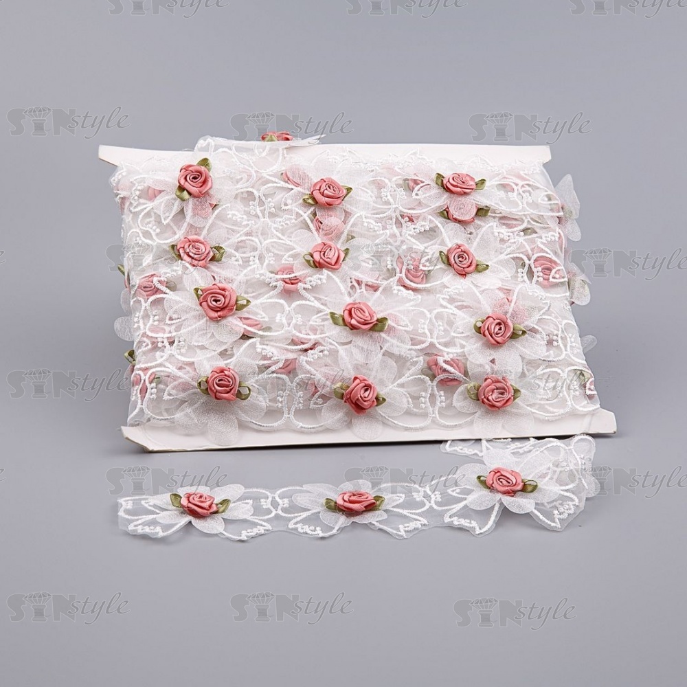 Кружево из органзы "Бантики с цветочками" , цвет белый+розовый, намотка 10 ярдов, ширина 45 мм