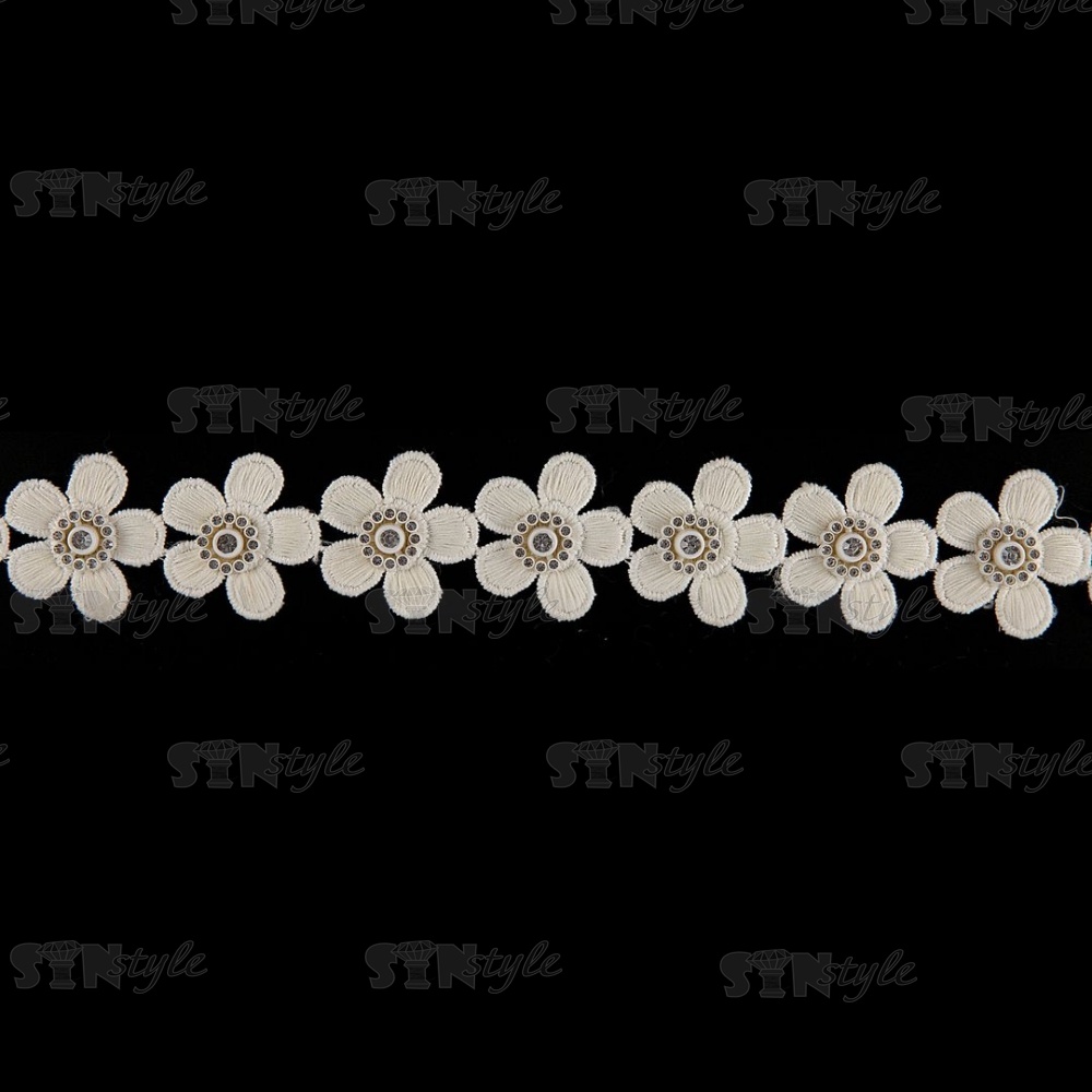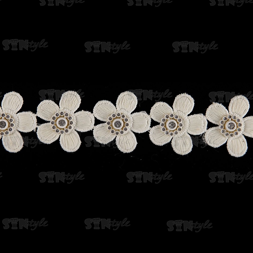 Кружево Цветочное, декорированное стразами, ширина 40 мм, намотка 15 ярдов, цвет белый