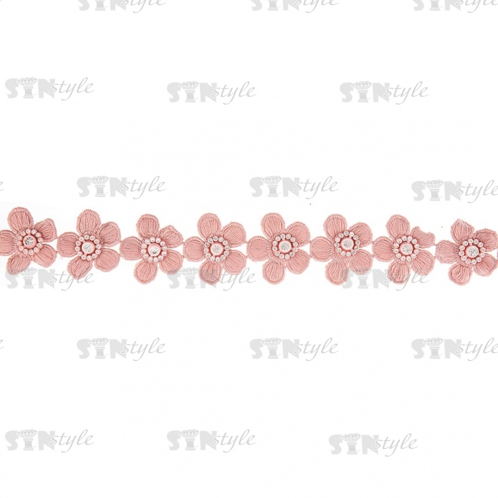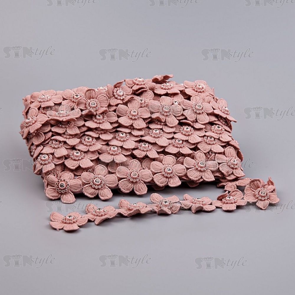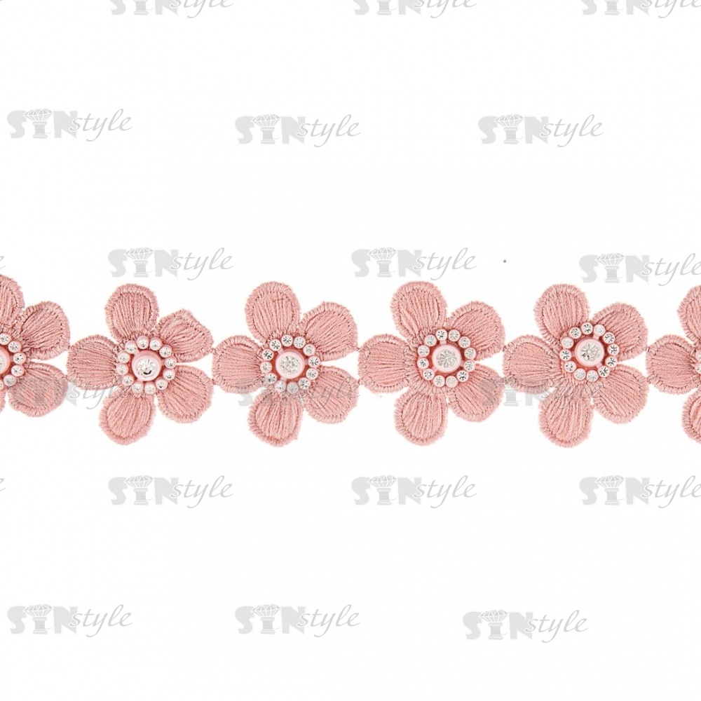 Кружево Цветочное со стразами, красивая цветочная гирлянда с белой стразой в центре цветка, ширина 40 мм, цвет грязно-розовый/стразы белые, намотка 10 ярдов