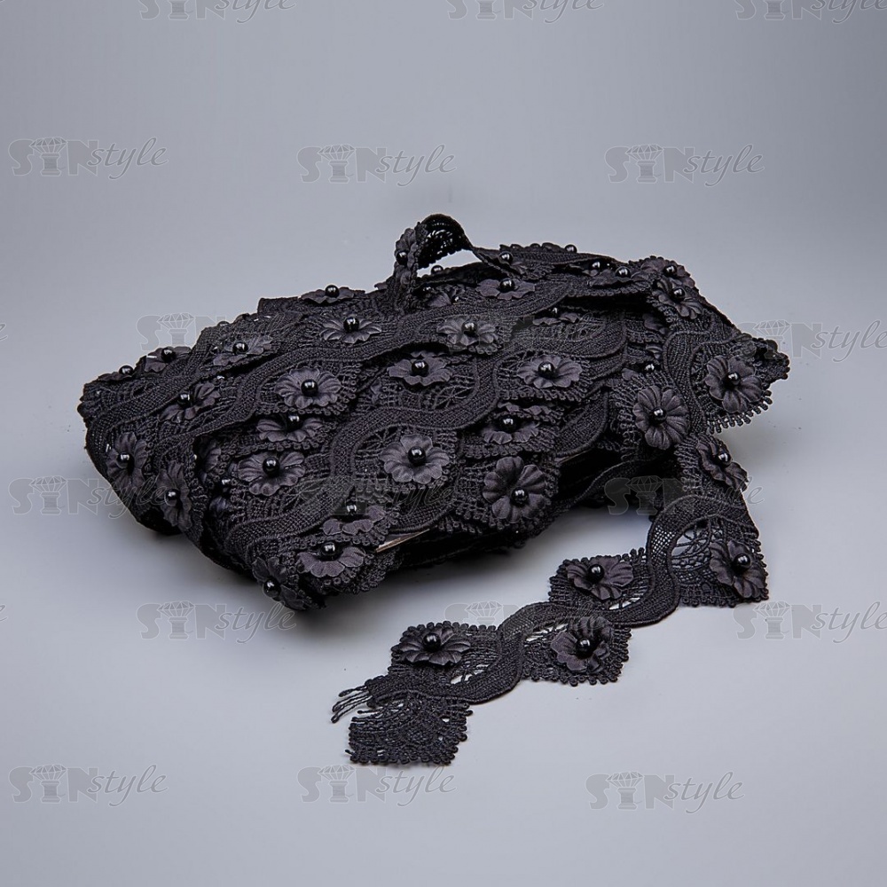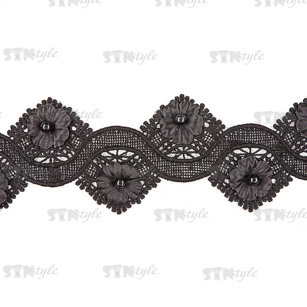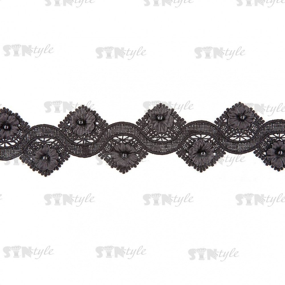 Кружево ажурное с отделкой, нежнейшее тонкое переплетение гирлянды с цветочными мотивами с бусиной в центре цветка в интересной зигзагообразной форме, ширина 45 мм, намотка 15 ярдов, цвет черный