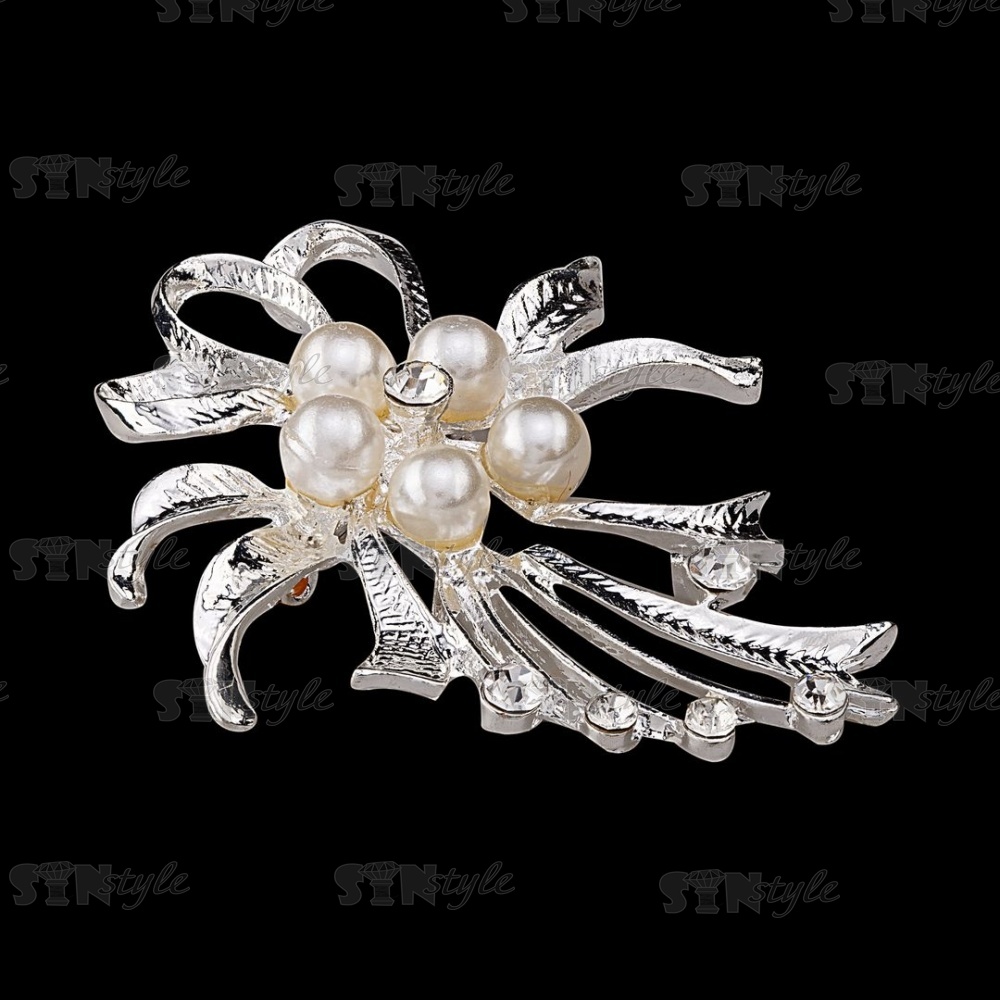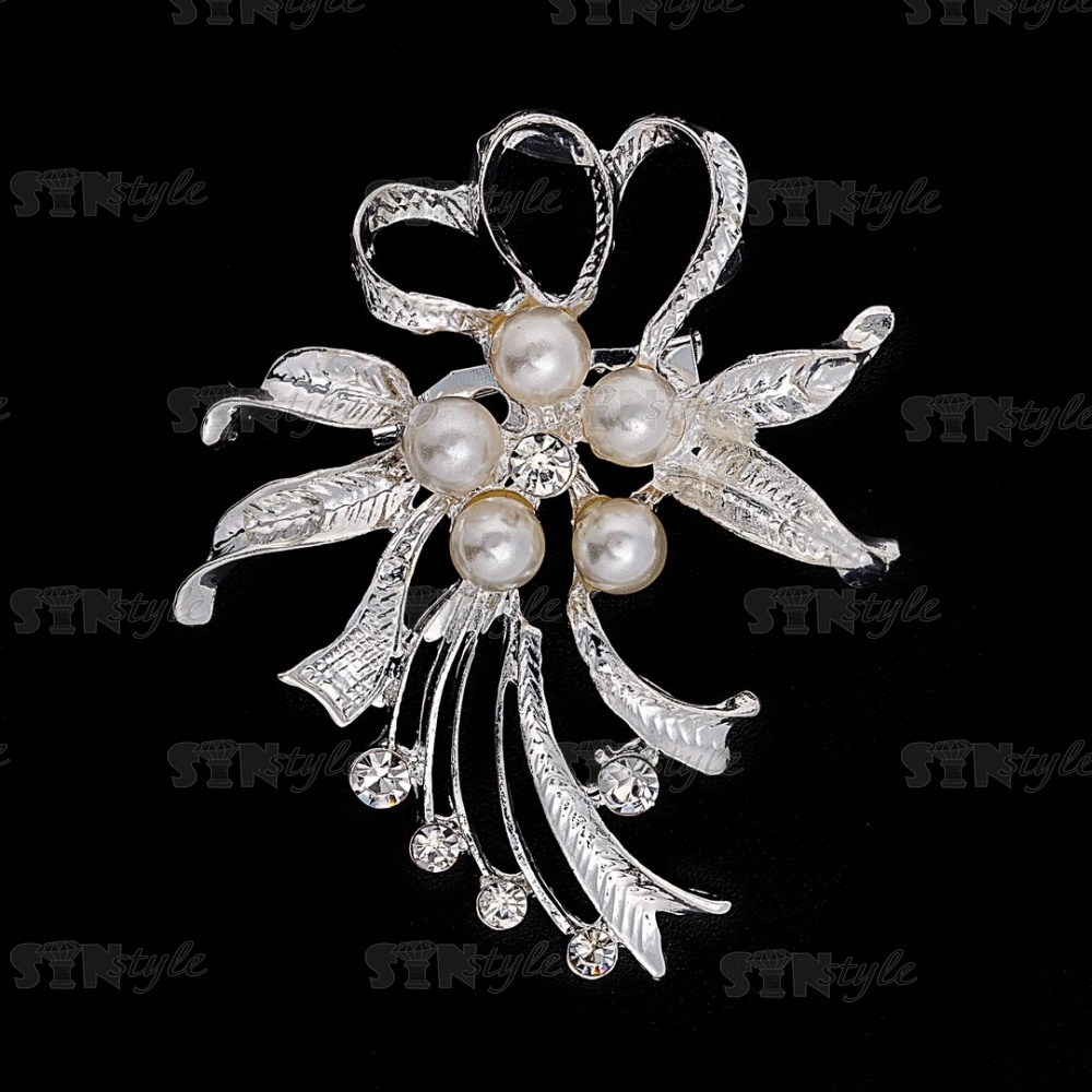 Брошь со стразами "Цветок", размер 43х52 мм, цвет никель+стразы и бусины белые, застежка булавка