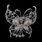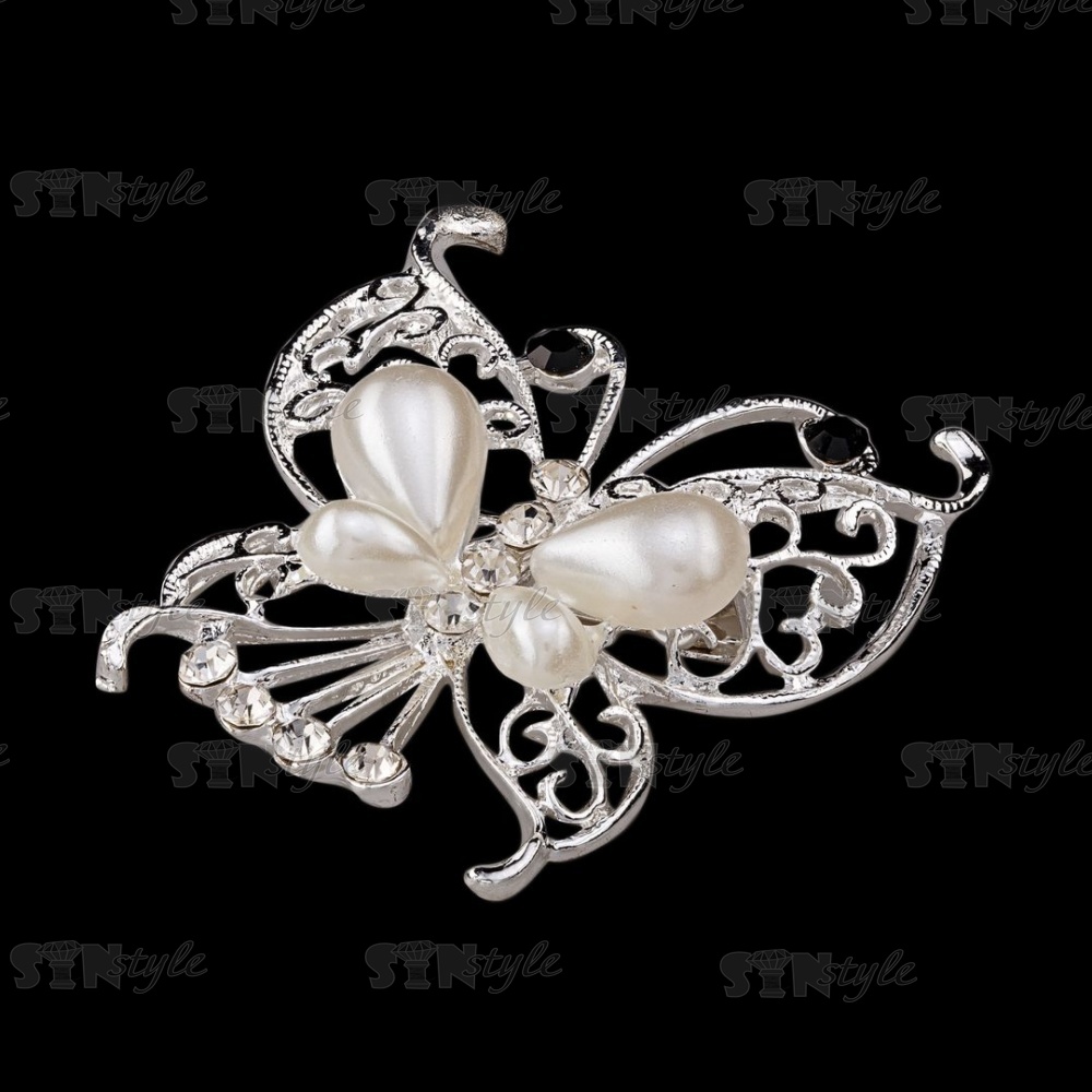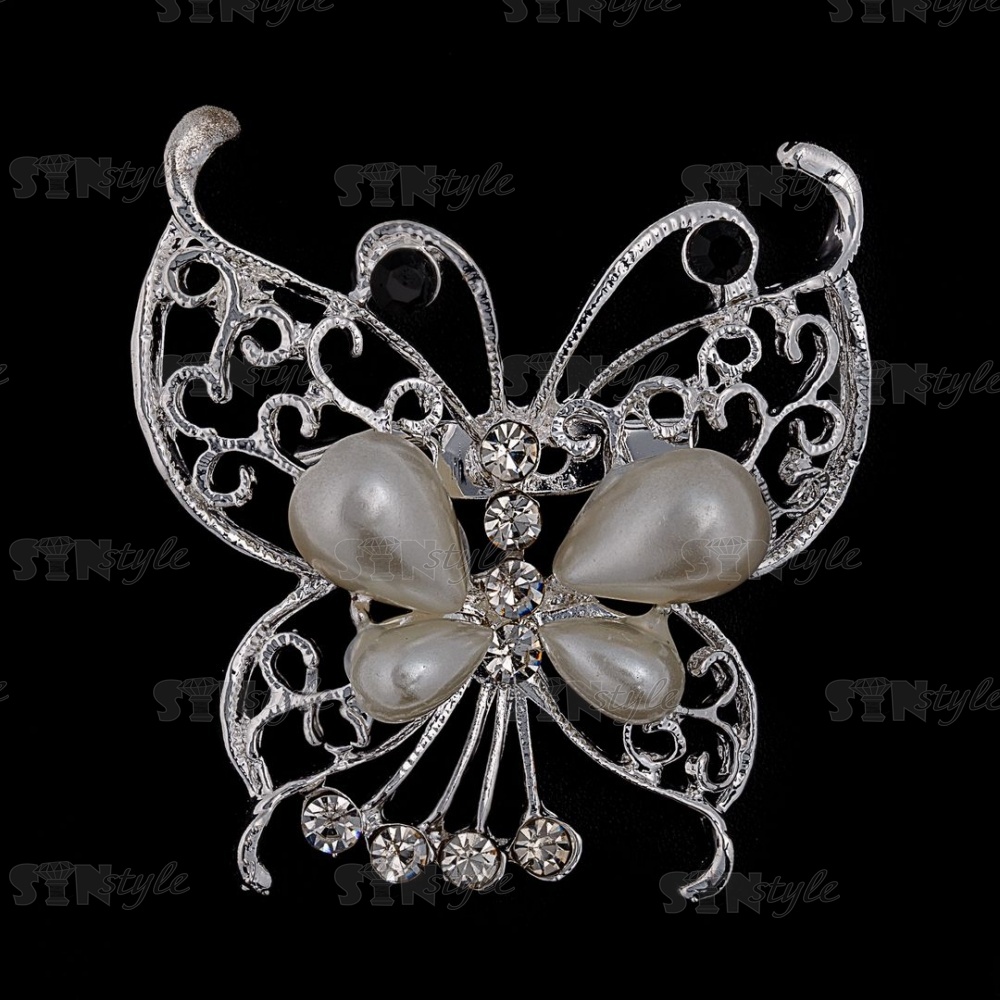 Брошь "Бабочка", размер 45х48 мм, цвет серебряный+белые стразы и бусины, застежка булавка