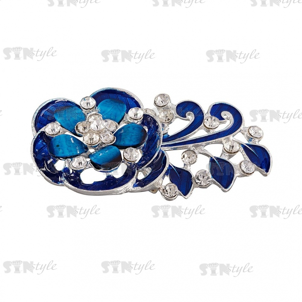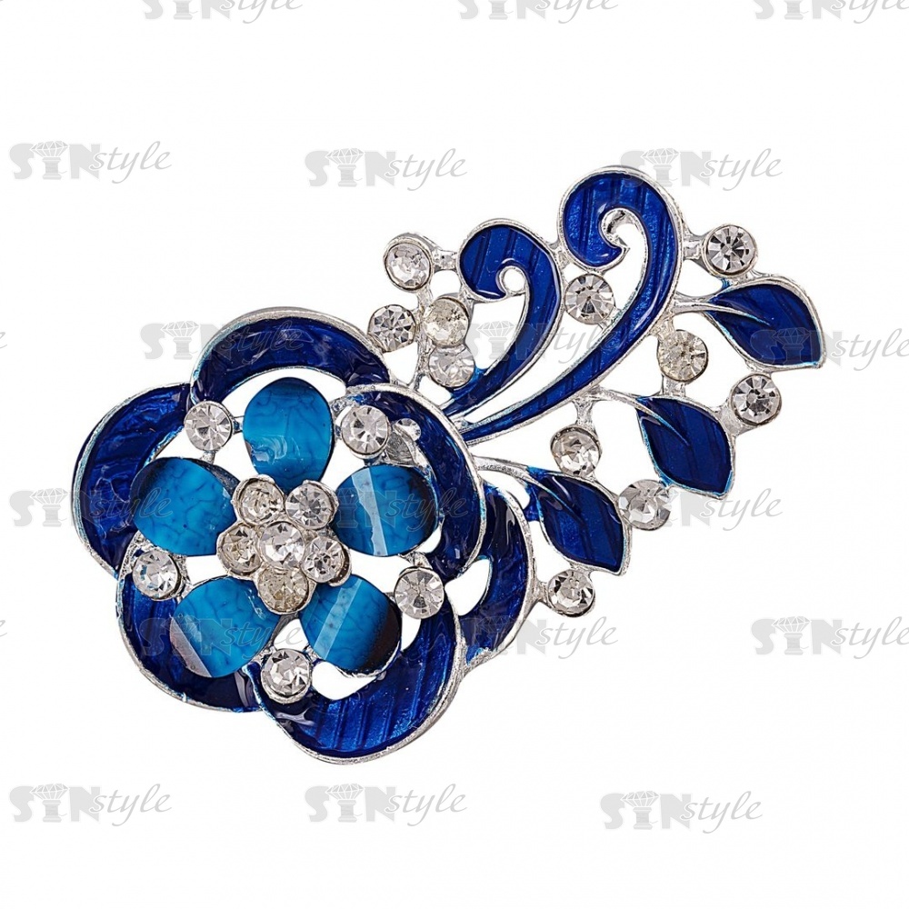 Брошь металлическая, застежка булавка, размер 34 мм х 58 мм, цвет серебряный+синяя эмаль+белые стразы