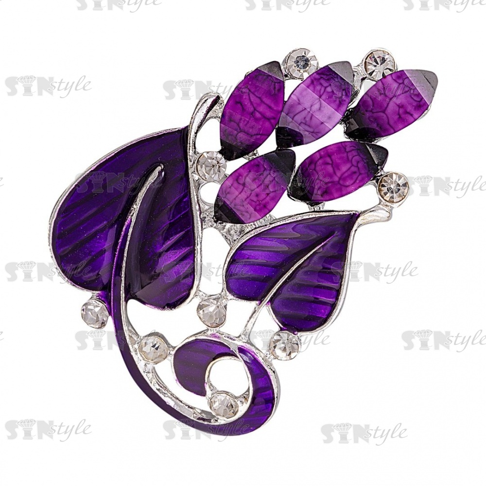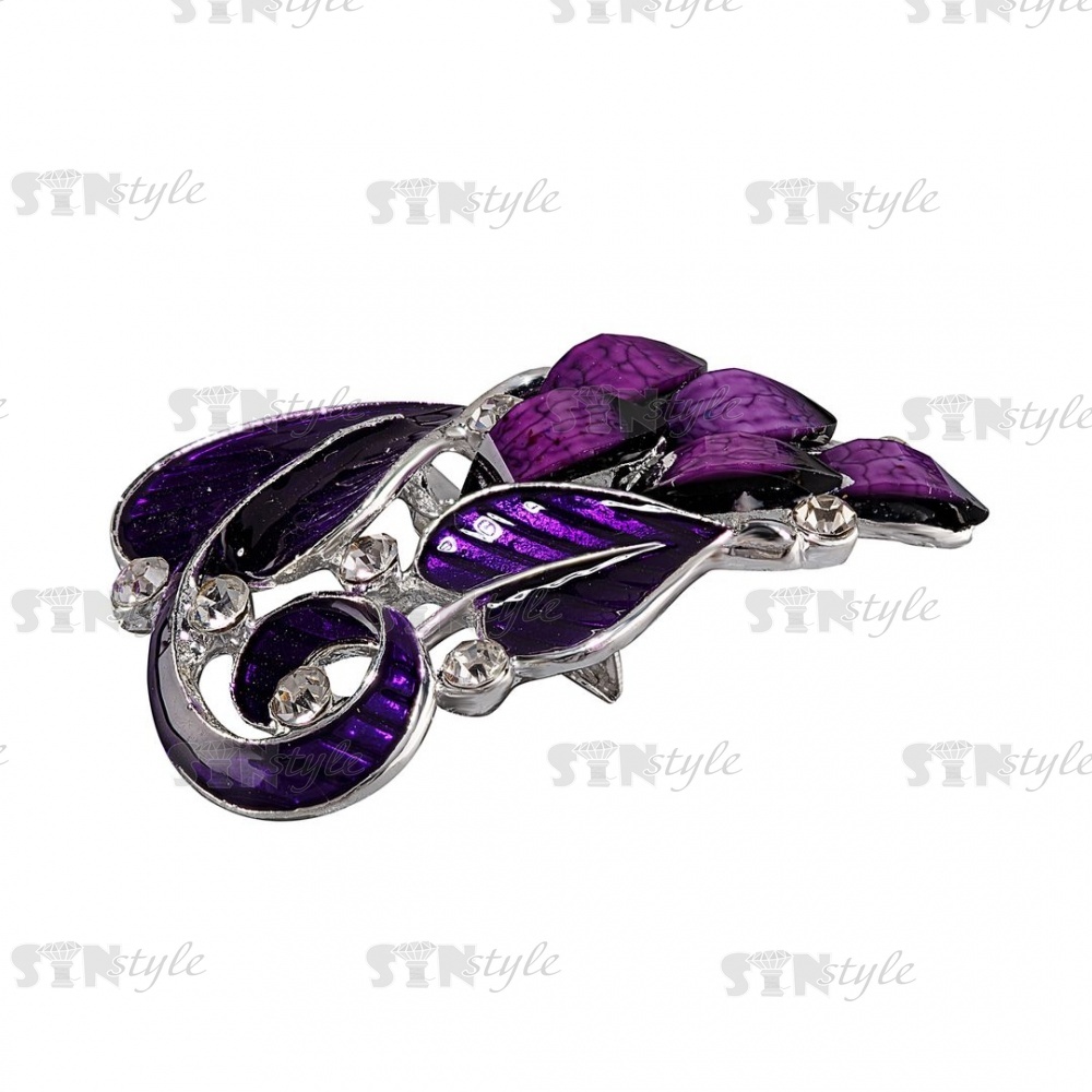 Брошь металлическая, застежка булавка, размер 32х45 мм, цвет серебряный+фиолетовая эмаль+белые стразы
