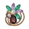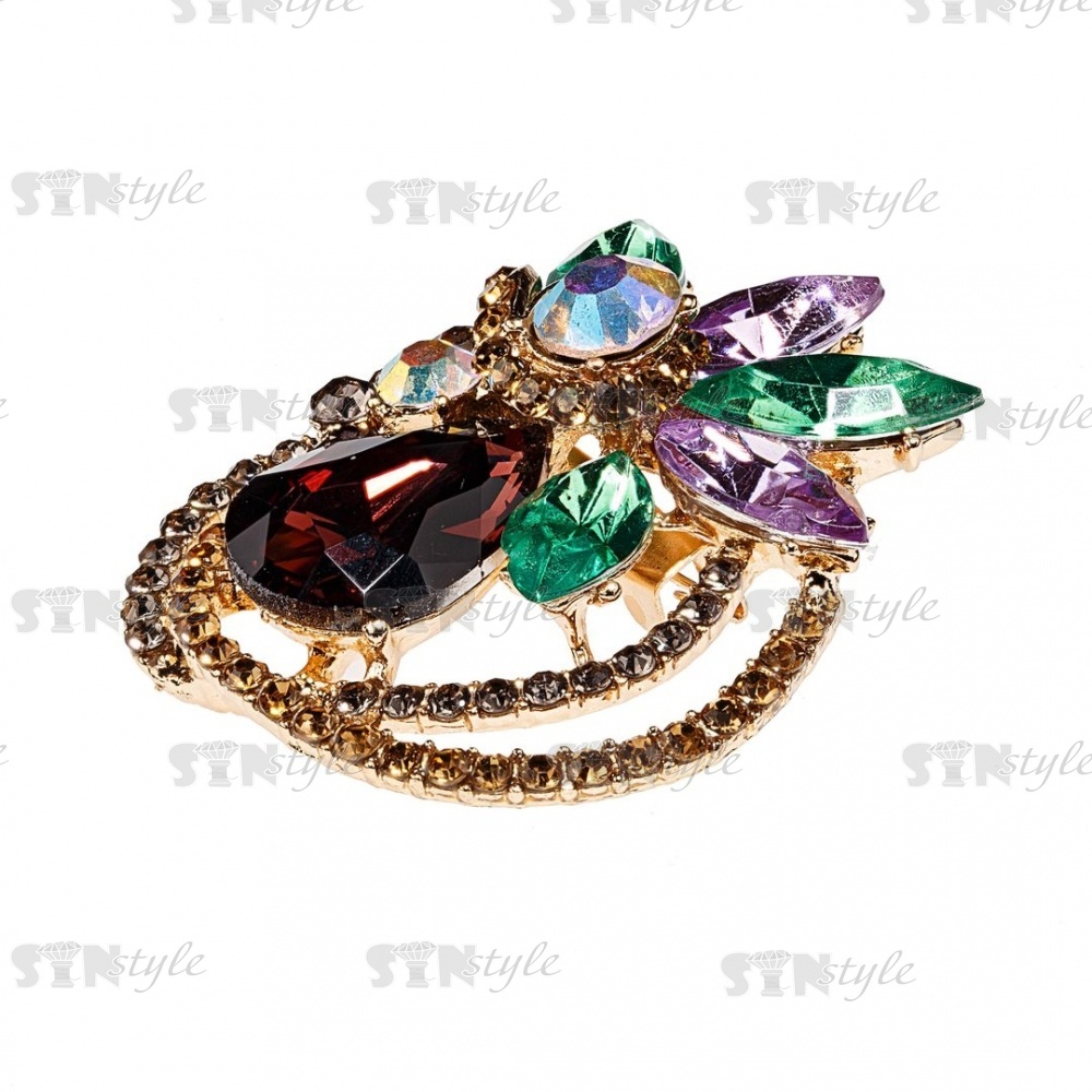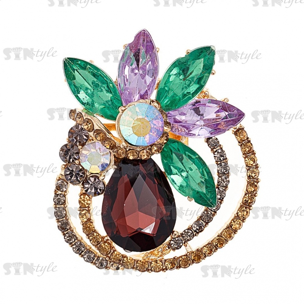 Брошь со стразами, размер 35х42 мм, цвет золото+цветные стразы, застежка булавка