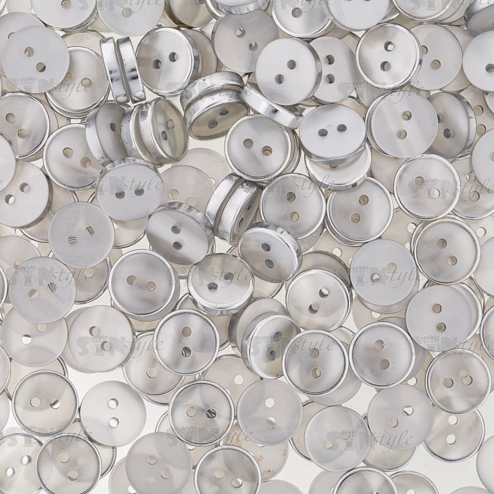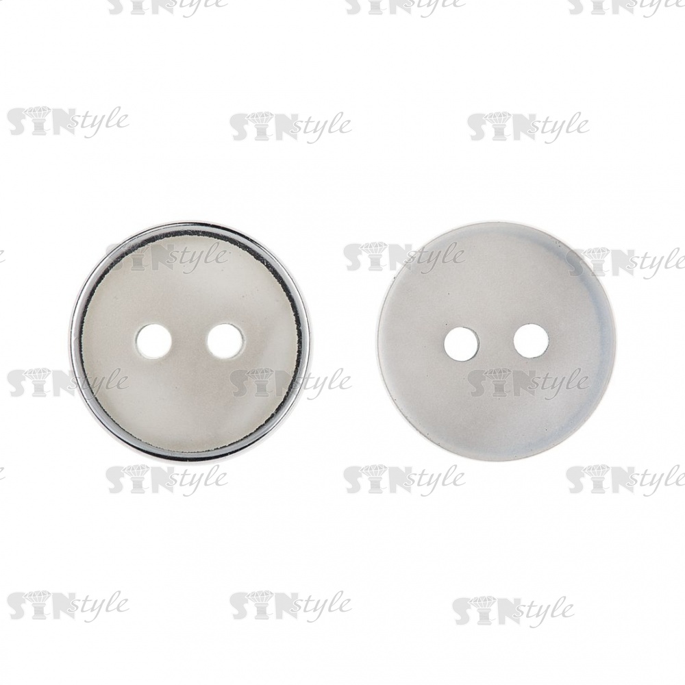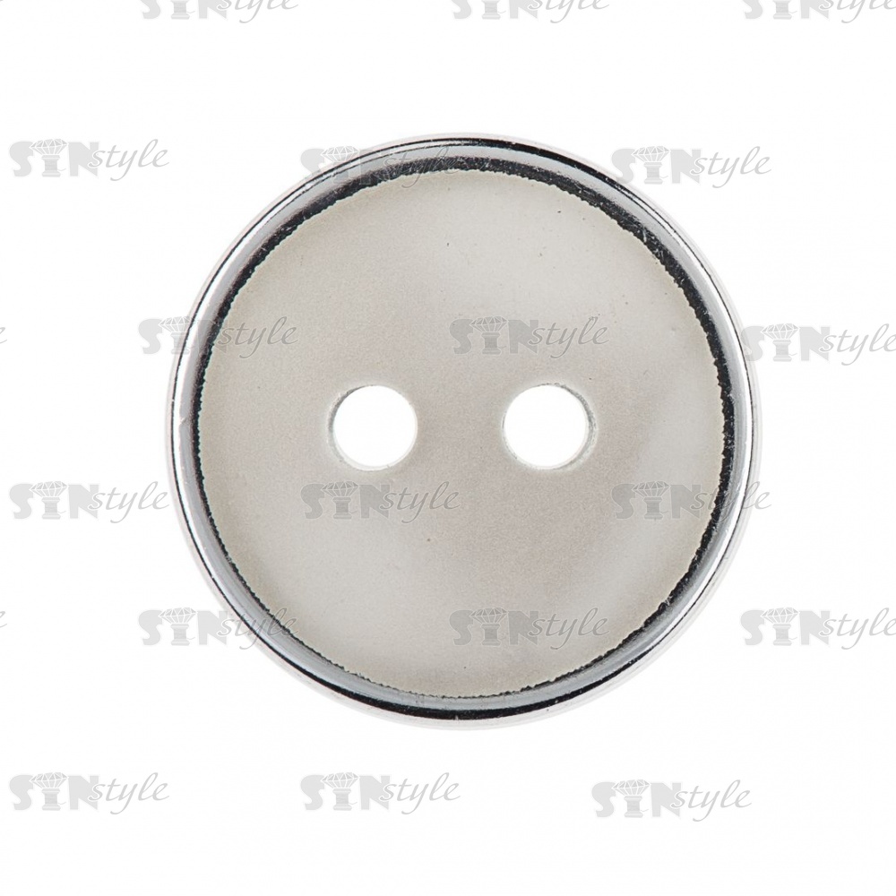 Пуговица пластиковая на два прокола, белая перламутровая с ободком цвет никель, 24L